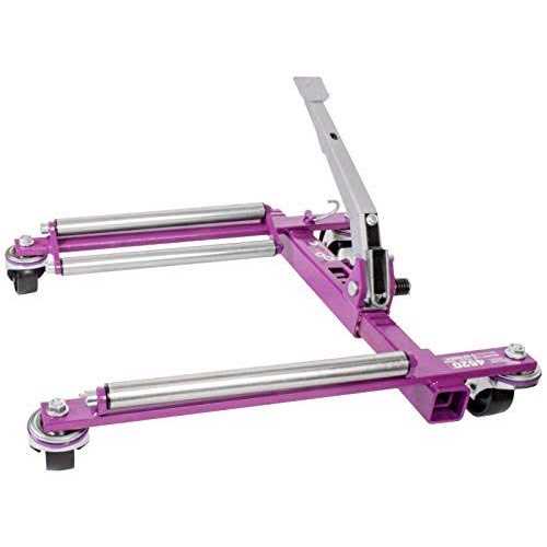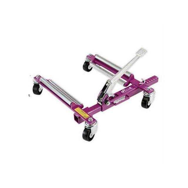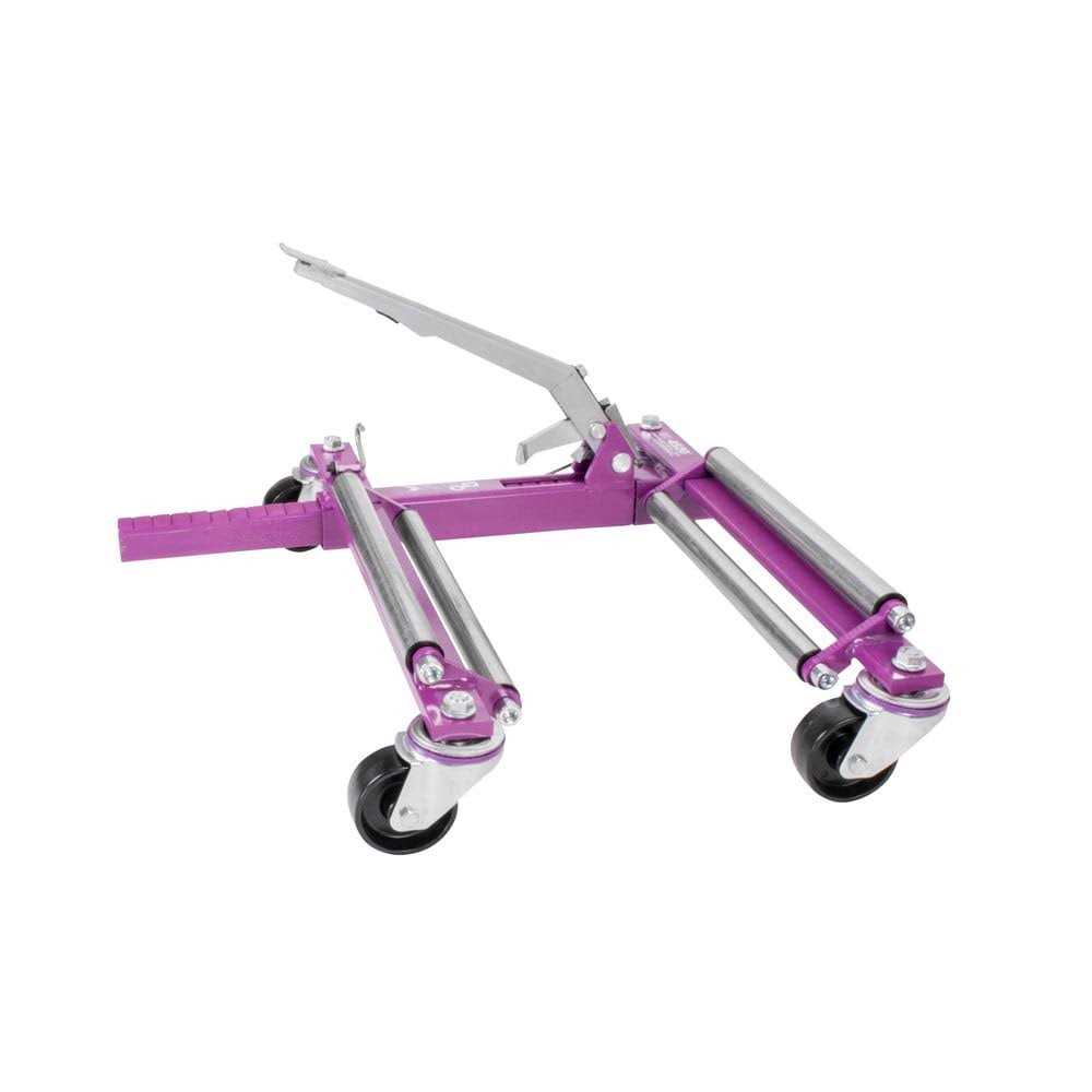 GoJak Operates on the principle of an quick action, bi-directional ratchet. Mechanical leverage applied to the foot pedal progressively “squeezes” the vihicle tire between two rollers until the tire lifts smoothly off the ground. The rollers touch only the tire – no contact with the vehicle’s frame or undercarriage is necessary. The low center of gravity after lifthing helps make GoJak safe and stable in use. It’s purely mechanical design eliminates the need for electrical power, hydraulic elements or compressed air. The Model 4520 Was developed for the race car industry. You can effortlessly lift and move cars with tires as wide as 20 inches and up to 36 inches tall. The unit will handle wheel weights off 1,125 lbs. (up to 4500 lbs with four units). Twin rollers on each axle guide the tire smoothly up and over the axle support bar to lift wider tires. The unit uses a bi-directional linear ratchet for the jack portion and has a 5-degree offset pedal angle fo additional foot-to-tire claerance. The Model 4520 series is recommended for use on smooth surfaces. The axle supports present a lower profile by using four very heavy-duty double-ball 3-inch diameter caster. However, smaller diameter wheels are less maneuverable on rough surfaces. Available in left and right hand units.