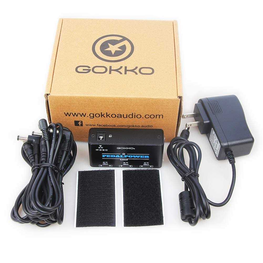 GOKKO Mini Guitar Effect Pedal Power Supply with 6 DC Output for 9V Effect Pedals GOKKO Supper Mini Guitar Pedal Power Supply: Input: AC 100V-240V Outputs: 2 ways 9V 100m – A 2 ways 9V 300m – A 2 ways 9V 500m – A This pedal power supply includes 6 tip negative DC outputs: 9V/100m – A*2, 9V/300m – A*2, 9V/500m – A*2. Super compact size power station, dimensions: 7.8*4*2.2 cm, its much easier to attach on a pedal board and will save lots of space. Separate short-circuit protection for each output port. Made of high quality aluminium alloy, its light-weight, durable and portable. The box contains: supper mini power station x 1, power cable x 6, adhesive Velcro tape x 1.