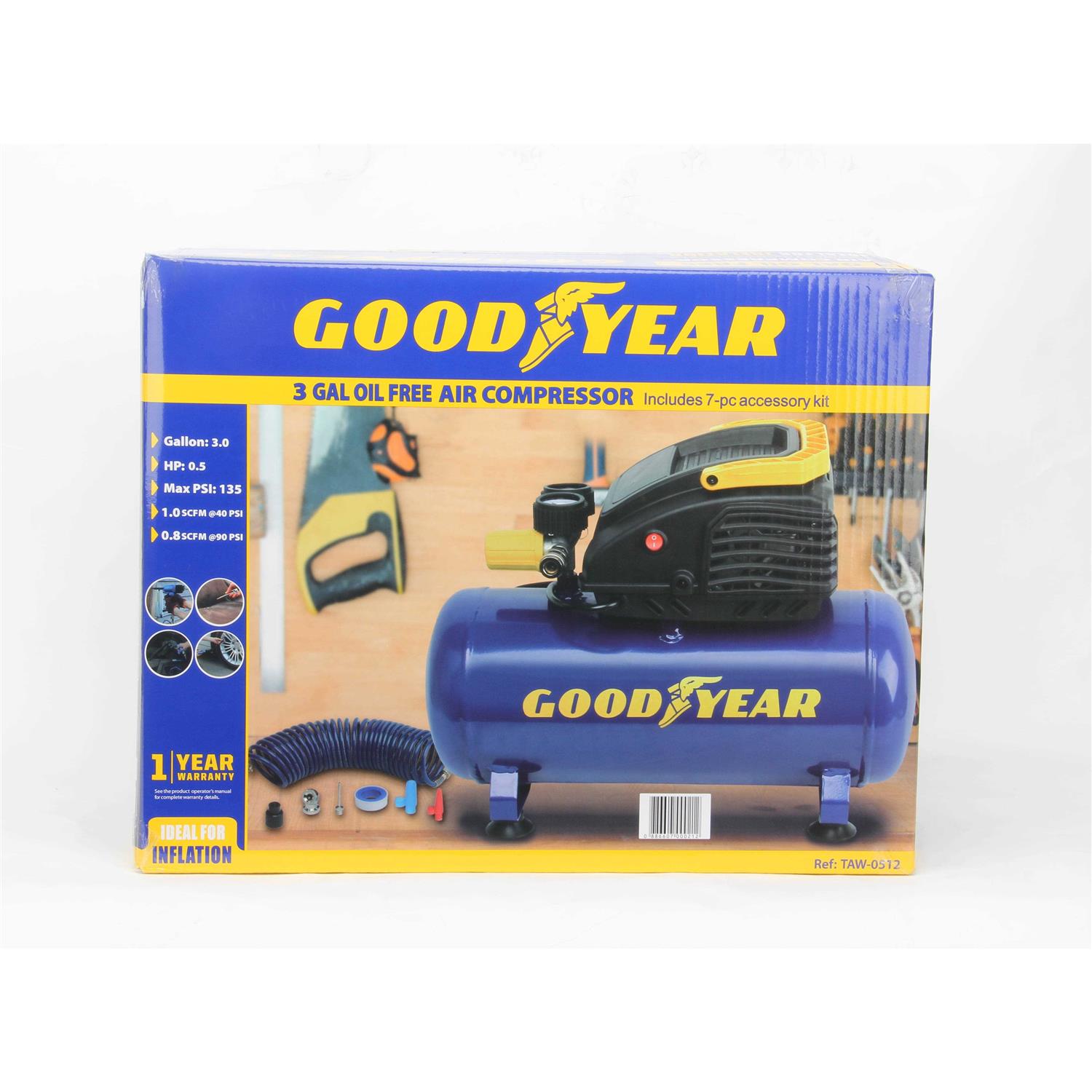This Goodyear 3 Gallon Air Compressor has a .5Hp long lasting Induction Motor. It has an oil free and maintenance free pump. The Goodyear 3 gallon is light weight with and an ergonomic handle for easy portability. This small unit boast of 135 psi and 1 SCFM @ 40 PSI. It runs off standard 120 Volt household current. This unit is great for inflating tires, operating a brad nailer or stapler and other small house hold jobs. Hose and accessories are included. Color: Blue.