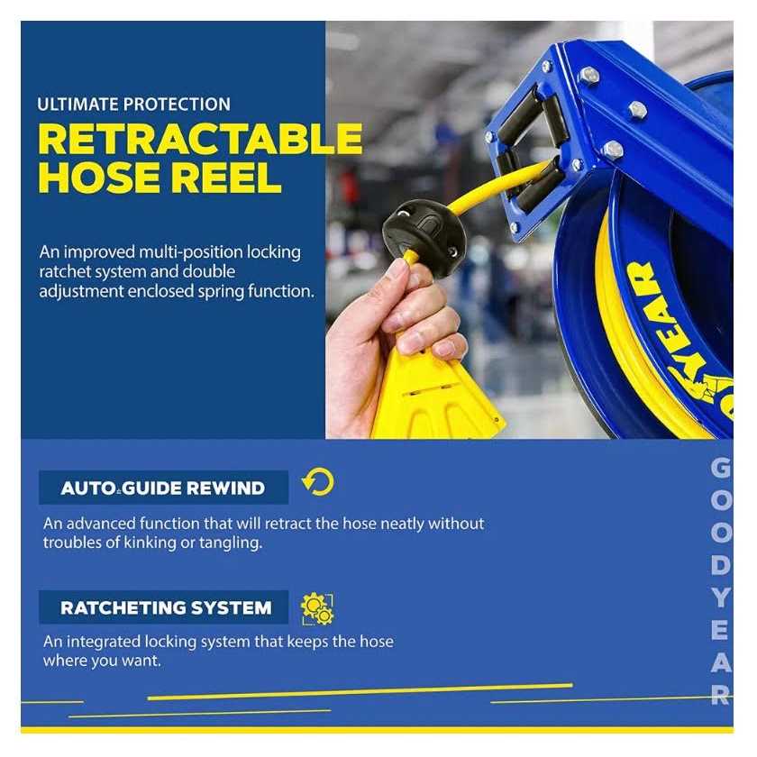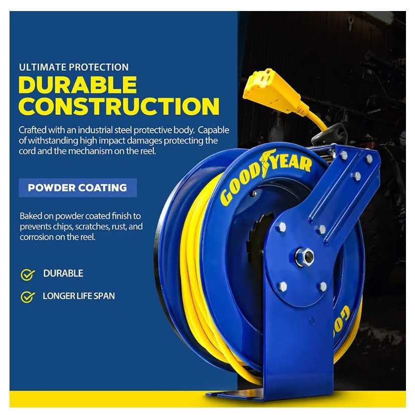 Buy the Goodyear Industrial Retractable Extension Cord Reel perfect for industrial, professional, and DIY applications. Ultra-durable, versatile, and with SJTOW cables resistant to harsh conditions. With 3 grounded outlets, 14AWG, and a max of 13A, this is definitely a must-have in every toolbox.
