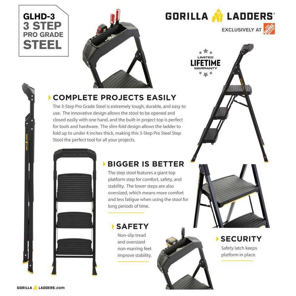 The newly-designed Gorilla Ladders 3-Step Pro-Grade Steel Step Stool is designed for toughness and dependability that help you get the project done. The sturdy steel construction and oversized steps combined with a 300 lbs. load capacity provide stability, comfort and safety. The convenient built-in project top is perfect for holding your hardware and tools and the non-slip treads and large, non-marring feet will keep you feeling secure on the ladder.