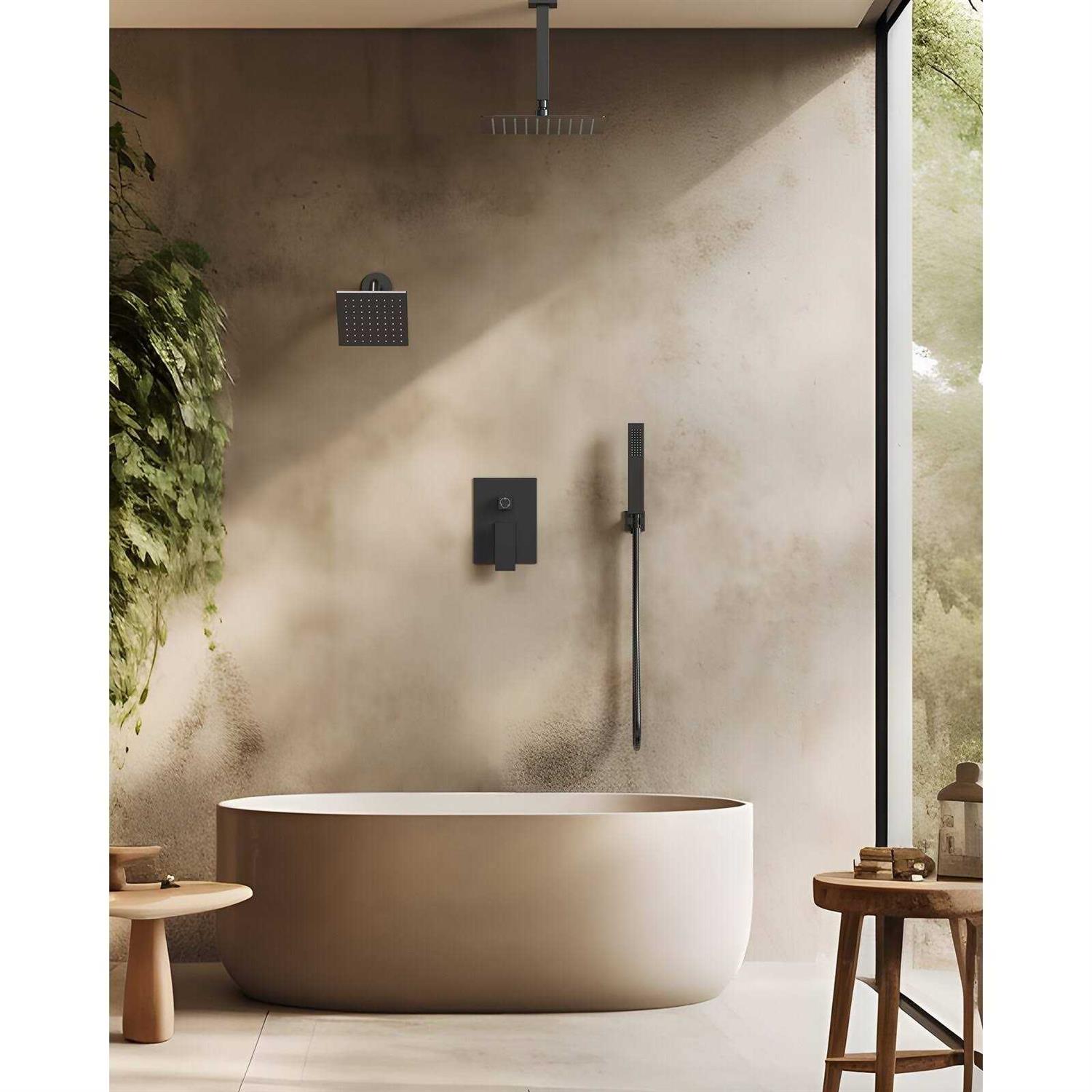 Celebrate unmatched bathing luxury with GRANDJOY Dual Shower Head design. Immerse in the extravagance of 2 rainfall showers (a 10 in. ceiling mount and a 6 in. wall mount), supplemented by a handheld unit for customized comfort. Select from 3 unique spray patterns, each designed to be used independently, promising a personalized shower experience. The built-in pressure balance valve ensures consistent water temperature, offering you peace of mind against sudden changes due to toilet flushes or running appliances. With its sleek design exuding sophistication, upgrade your bathroom now for a rejuvenating spa-like retreat right at home. Color: Matte Black.