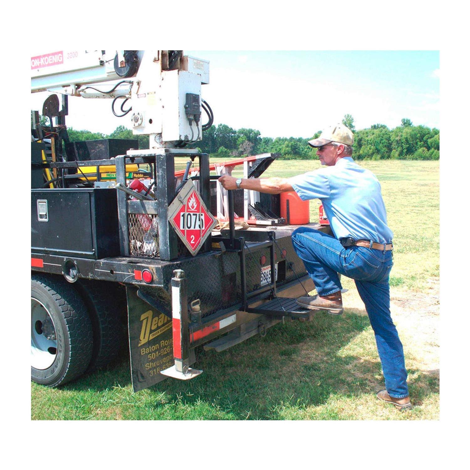 A step-up for bike and ATV? owners, aging pets and aging truck owners. Perfect seat for hunters, for sporting clay shooters, tailgaters and for work on the job. Attaches to the tailgate of standard pickup trucks and stores compactly away Step/seat platform is supported by 1,700 lbs. test cables and built-in traction ridges for sure footing 300 lbs. weight limit Made in USA.
