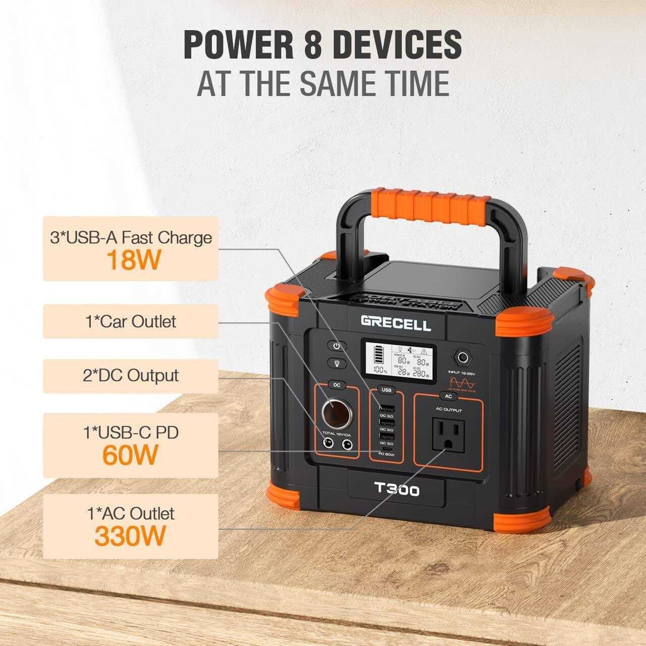 The upgraded BMS provides built-in overload, overcharge (automatically stops charging when the device is fully charged) and short circuit protection. Dual built-in silent cooling fans help keep the power station at a safe temperature. 【288Wh capacity, 330W output】330W (600W surge) pure sine wave supports most laptops, tablets, mobile phones, lights, fans, CPAP medical equipment, projectors, TVs, mini refrigerators (less than 9V), speakers, cameras ( rated power less than 330W). This is a mini power station that can be quickly taken hiking or camping, which is much larger and heavier than high-capacity power stations. The top handle makes portability easier. 【USB-C PD 60W, USB-A QC 18W】PD60W fast charging makes it possible to quickly charge Android and iPhone, tablets and laptops, more than twice as fast as other standard USB-C outputs, super efficient in emergencies. All USB-A ports are Quick Charge 3.0 18W, providing greater efficiency for each device. 【Power 8 devices at the same time】Equipped with 1*AC output, 1*USB-C PD 60W output, 3*USB-A QC3.0 18W output, 1*Car port, 2*DC output, the GRECELL solar generator can simultaneously power 8 devices can be powered (as long as their total power consumption is less than 330W). Each switch can control each output module. 【Package Content 】1* GRECELL 288Wh portable power station, three charging cables (1*AC charging cable, 1*car charging cable, 1*MC4 to 7909 solar charging cable), 1*user manual.