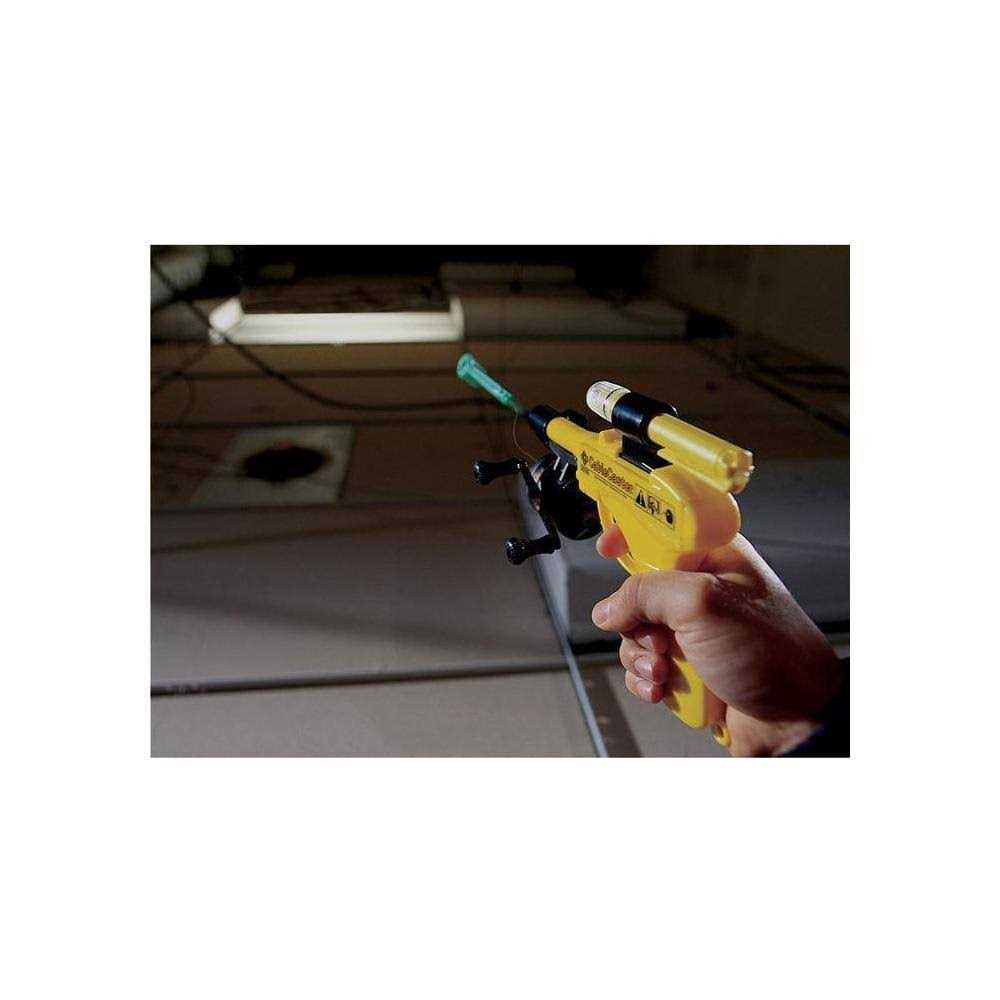 Guide Cable Through Hard-to-Reach-Spaces, Useful in Ceilings, Rafters & Sub-Floors, 50′ / 15m Range, Easy-to-Find Bright Yellow Body, Aerodynamic Darts for Improved Accuracy, Glow-in-the-Dark Darts for Easy Location, Optional Flashlight for Added Visibility. Install communications cables faster and with greater control and ease with the yellow CableCaster from Greenlee. This tool is designed for use with suspended ceilings rafters sub-floors and other hard-to-reach spaces. The 50-foot range results in fewer pulls and greater productivity. The bright yellow CableCaster body is easy to find and also helps remind workers to take it with them when the job’s completed. Darts are aerodynamic for improved accuracy and glow-in-the dark for easy location. An optional flashlight provides added visibility.