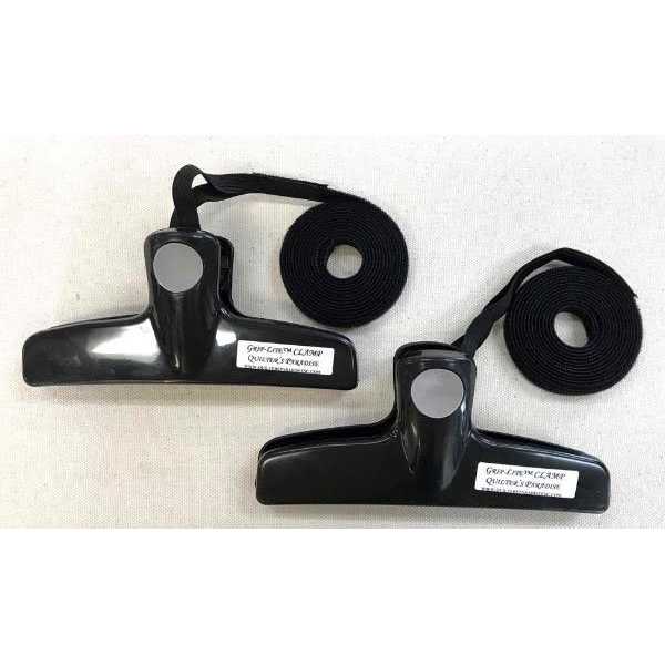 For use with Longarm and Midarm Quilting Machines Even tensioning of fabric Lightweight providing secure 6-inch grip Easily open with one hand Come in black or Red colors Tired of heavy, hard-to-squeeze and use side clamps for your Longarm / Midarm quilting machine? Or clamps that grip and pull on only an inch or two of the quilt thereby distorting the side of the quilt? No more! The Grip-Lite side clamps are super lightweight providing a secure 6-inch grip and easily opened with one hand! Each clamp comes with 6 feet of double-sided hook and loop tape and a short elastic strip for fast attachment to any frame. And testing your machine’s tension has never been easier. Whether two clamps are used on each side of the quilt or just one is based on personal preference and the size of the machine being used. Weighing only 4 ounces (including the Velcro strap), the Grip-Lite side clamps don’t weight the quilt down unlike other side clamps. Also, the Grip-Lite side clamps’ jaws are 6 inches wide providing a more uniform grip across the mounted quilt thereby avoiding distortion. The Velcro strap will attach to itself because one side is the hook side and the other side is the loop side. This allows the Grip-Lite side clamps to attach easily to any frame. The strap is about 6 feet long and 3/8″ wide. Also, there is a short piece of elastic sewn onto the Velcro and that loops through a hole on the clamp. This facilitates clamping the clamps onto the quilt.