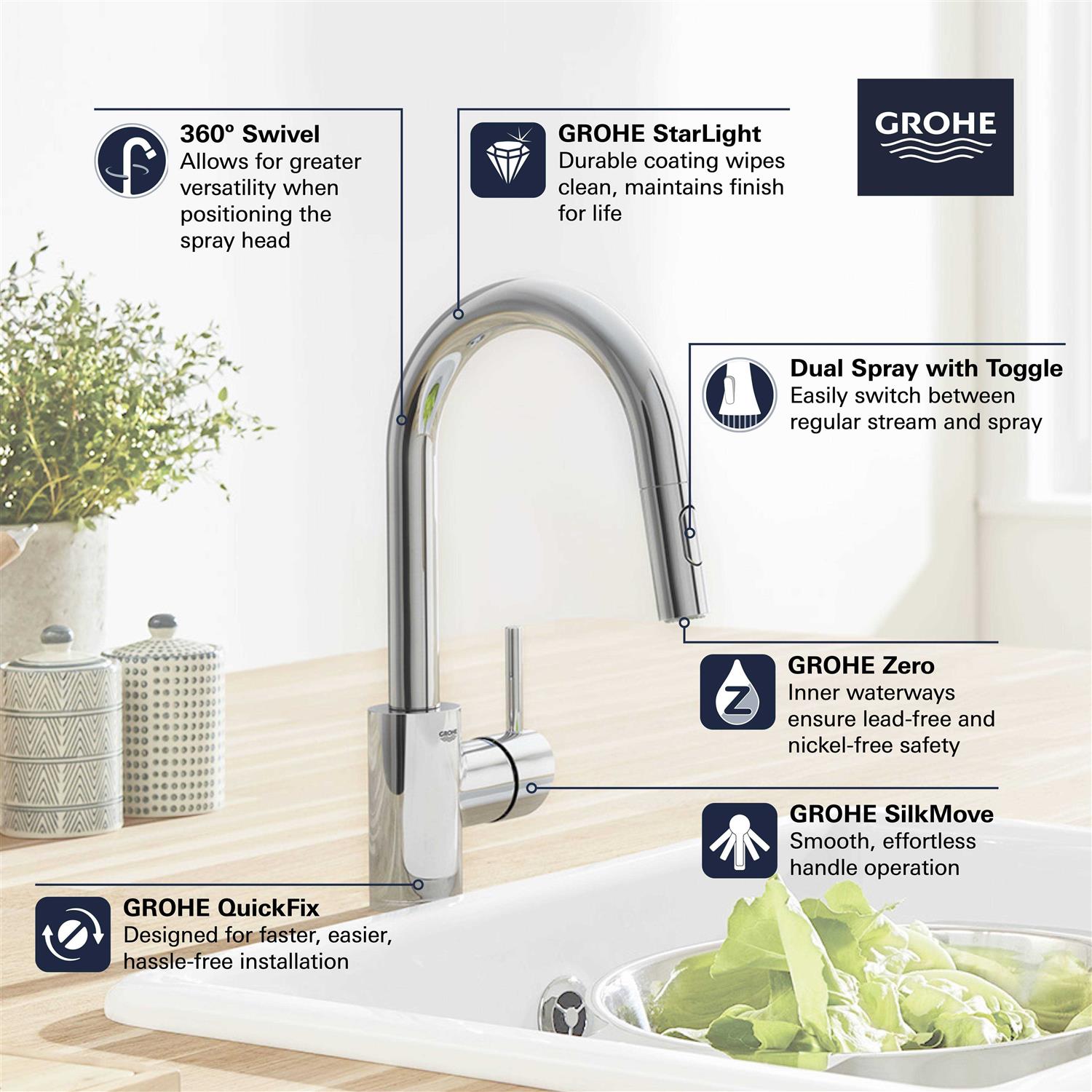 - EASY TO CLEAN: Kitchen faucet sprayer features GROHE SpeedClean rubber nozzles to quickly wipe away limescale with your fingertip
