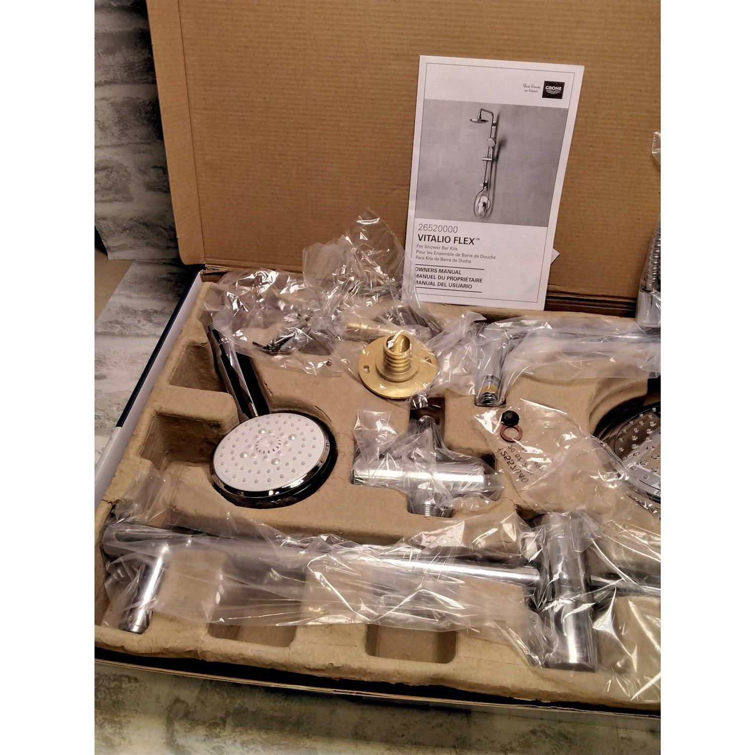 The European-designed Grohe Vitalio Flex Shower System redefines pure shower enjoyment with an all-in-one system that revitalizes you every time you step into the shower. The sleek, contemporary-style kit consists of a fixed 7 in. Rain showerhead and a 4 in. handshower with a metal hose, as well as a 24 in. rail and all mounting supplies, including adhesive and optional screws. The handshower offers four spray settings-Rain, RainO2, Jet and Massage-each optimized with GROHE DreamSpray technology to ensure even, consistent coverage. GROHE SpeedClean nozzles make maintenance a breeze, requiring only a quick wipe to remove limescale buildup. No extra tools are required for installation, as the shower system easily installs using existing wall outlets. The Vitalio Flex shower system is manufactured to meet Germany’s highest quality standards.