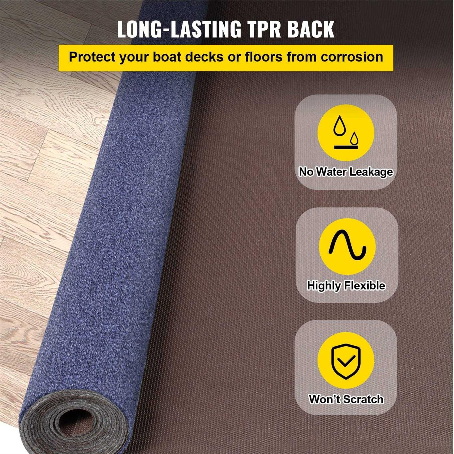 Premium Marine Carpet: Color: Deep Blue; Size: 6 x 18 ft (1.8 x 5.5 m); Carpet Thickness: 0.18 in (4.6 mm); Covering Area: 108 sq.ft (10 m²). Upgraded polyester fiber ensures our advanced marine carpet remains durable for years to come. Note: Different visual angles and lights would make the color looks various on the carpet. Non-slide Surface: Ribbed texture on the surface will add friction. With 0.17 in (4.5 mm) low pile height, this boat carpet not only avoids sliding but also keeps a soft feeling even when you walk on your bare feet. Water-proof Back: The backing of the outdoor carpet roll adopts soft rubber material, efficiently prevents water penetration, and doesn’t scratch the floor. Thus, you no longer need to worry about corrosion after long-term use. Effortless Cleaning & Installation: Stubborn stains can be quickly cleaned with a vacuum machine. Thanks to its only 0.18 in(4.6 mm) thickness, you can easily cut the bass boat carpet into any shape to fit any space with scissors or utility knives, and then use glue to finish the installation. Indoor & Outdoor Use: Ideal for kitchens, bathrooms, living rooms, patios, porches, decks, boats, sun-rooms, basements, garages, etc. Our soft boat carpeting becomes a necessity for your daily decorations.