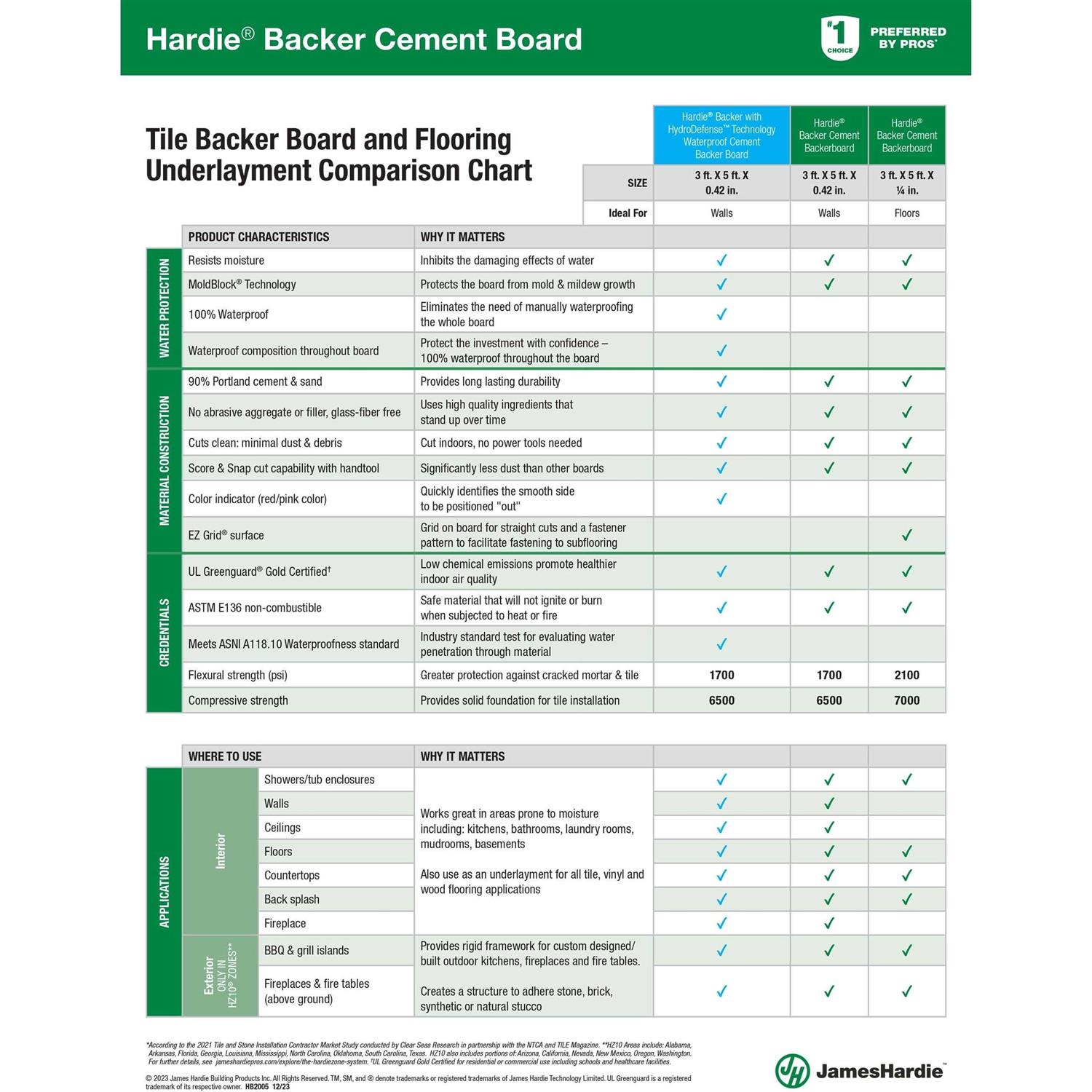 HardieBacker is the original fiber cement backer board. Made of 90% premium Portland cement and sand, it is the underlayment that best protects against damage from moisture and mold behind walls, floors and countertops. Its strength, ease of installation and durability make it the ideal product for wet area applications. HardieBacker is the superior choice among other cement, glass mesh and gypsum boards for tile, vinyl, carpet, and wood flooring installation.