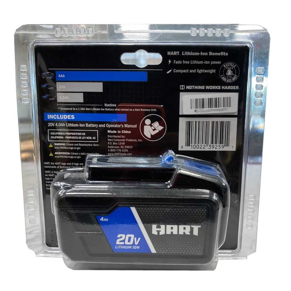 The HART 20V 4.0Ah Lithium-Ion battery is an excellent addition or start to any DIYers HART tool collection. This battery is compatible with all HART 20V power tools. It features Lithium-Ion technology to give you long-lasting and fade-free power to get you through any project you decide to take on. This battery is designed to be compact and lightweight for more maneuverability and while reducing user fatigue. Whether you are maintaining your yard with HART outdoor tools cleaning and maintaining your car with HART automotive tools or keeping cool and entertaining with HART lifestyle tools the HART 20V 4.0 Ah battery is there to provide the power you need when you need it with 4x longer runtime than the HART 20V 1.5 Ah Lithium-Ion battery. This battery is sold as a single battery and does not include a charger or a tool.