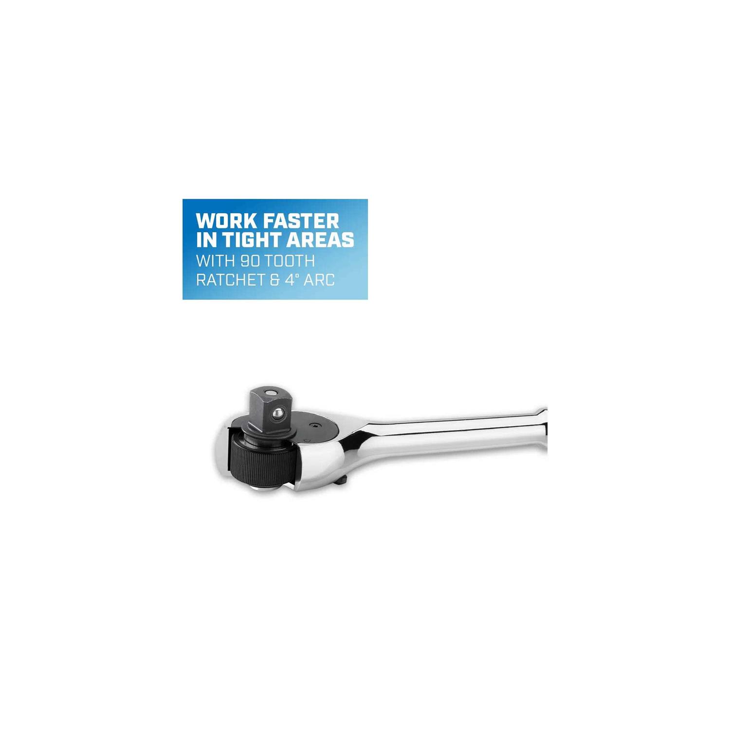 This 215 pc Mechanics Tool Set delivers the performance and durability you need to handle any job in the garage or at home. This set features an extensive range of SAE & metric sized sockets and drive tools. The 90 tooth ratchets allow up to 20% more access in tight spaces and the reverse switch lever lets you change working direction with one hand. The set includes (13) tools and adaptors, inch drive 6 point sockets (standard and deep well), 3/8 inch drive 6 point sockets (standard and deep well), inch 12 point sockets and screwdriver. For more specialty applications, included are star bits and variety of hex bit sockets. In addition, the chrome finish provides rust resistance for added durability and large size markings for quick and easy identification. The set comes in a durable case with metal latches and barrel hinges, plus additional storage space for maximum versatility.