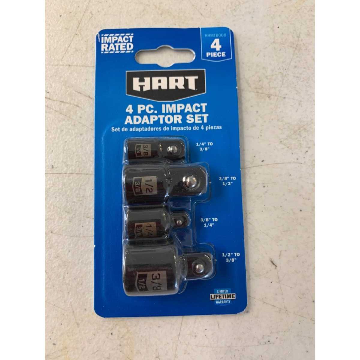 The HART 4 Pc. Impact Adapter Set is made from impact-rated CRV steel. These adapters offer superior strength during high torque applications. Set includes (1) 1/4-inch to 3/8-inch drive square adapter; (1) 3/8-inch to -inch drive square adapter, (1) 3/8-inch to -inch drive square adapter and (1) 1/2-inch x 3/8-inch drive square adapter.