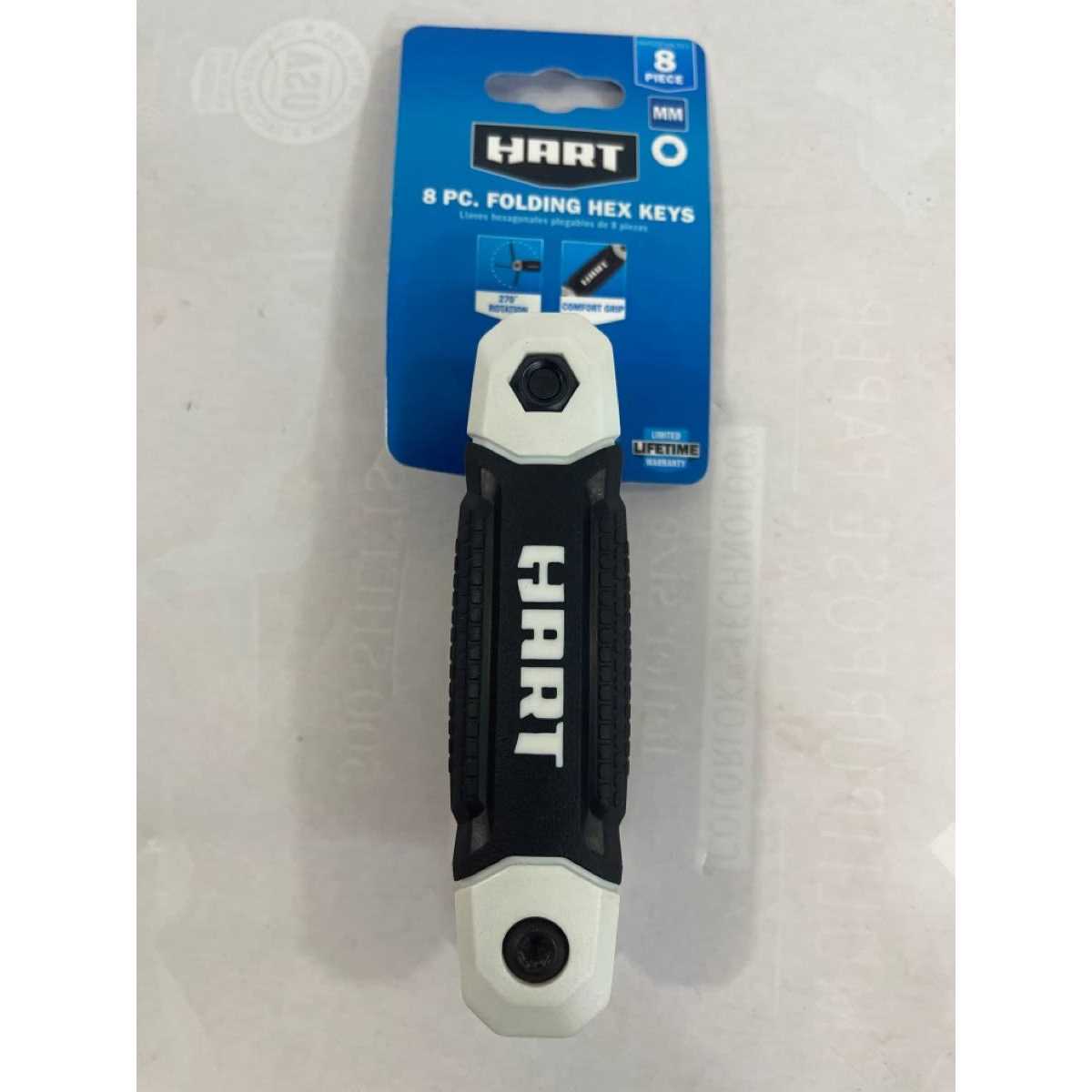 The HART 8 PC. Folding Hex Keys rotate up to 2700 for better torque and easier access to tight spaces. The rubber overmold housing provides a secure and comfortable grip. Sizes include (8) MM: 1.5mm, 2mm, 2.5mm, 3mm, 4mm, 5mm, 6mm & 8mm.