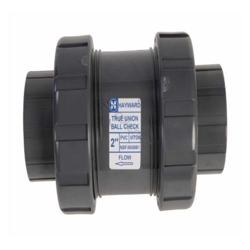 TC Series true union check valves with EPDM seals Made of heavy wall plastic material True union check valves prevent backflow meets ASTM and NSF standards True union design allows easy removal from system without breaking down piping connections Pipe measures 2-inch socket/threaded end connection Hayward TC Series true union check valves with EPDM seals is made of heavy wall plastic material. As line flow enters the valve, a ball is moved by the flow pressure allowing flow to pass through and open the valve. As inlet flow ceases or recedes (back pressure), the ball is moved to the seat or seal stopping the flow, thus closing the valve. True union design allows easy removal from system without breaking down piping connections. Pressure rating 150 PSI. Meets ASTM and NSF standards.