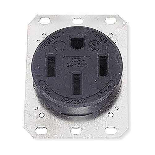 Hubbell HBL9450A ReceptacleHubbell’s Wiring Devices division offers a wide array of electrical and electronic wiring devices, wire management systems, occupancy sensors, lighting controls and specialized wiring products for the marine and healthcare markets.3P4W, 50A 125/250V, 15-50R, Black RTP.Hubbell HBL9450A Receptacle Features: Product Type: Flush-receptacles Receptacle Style: Single Face Shape: Standard Standard: NEMA Amperage: 50A Voltage: 125V/250V Poles and Wires: 3 Pole, 4 Wire Grounding Wiring Method: Back and Side Hospital Grade : No Receptacle Grade: Heavy Duty Spec Grade Face Style: Finder Groove NEMA No.: 14-50R Horsepower: 3(2) Description: Heavy Duty Straight Blade Single Receptacle Type: 3 Pole, 4 Wire, Grounding Rating: 50A, 125/250V Certification: UL, CSA, Fed Spec Terminal Screw Material: 3/8″ Allen Head, Plated Steel Ground Screw Material: 3/8″ Allen Head, Plated Steel Top Material: Glass Reinforced PET Base Material: Glass Reinforced PET Power Contacts Material: .040″ (1.0) Brass Mounting Strap Material: .062″ (1.5) Plated Steel Mounting Screw Material: Steel-Zinc Plated Box Terminals Material: Copper Dielectric Voltage: Withstands 2,000V minimum. Current Interrupting: Certified for current interrupting at full rated current. Temperature Rise: Max 30 DegreesC temperature rise at full rated current after 50 cycles of overload at 150% of rated current at a power factor of 75%.. Terminal Identification: Terminals identified in accordance with UL498 (Brass, White, Green). Terminal Accommodation: #12-#6 AWG copper stranded or solid conductor only. Product Identification: Ratings are a permanent part of the device. Flammability: UL 94 V0. Operating Temperatures: Maximum continuous 75 DegreesC, minimum-40 DegreesC (w/o impact).