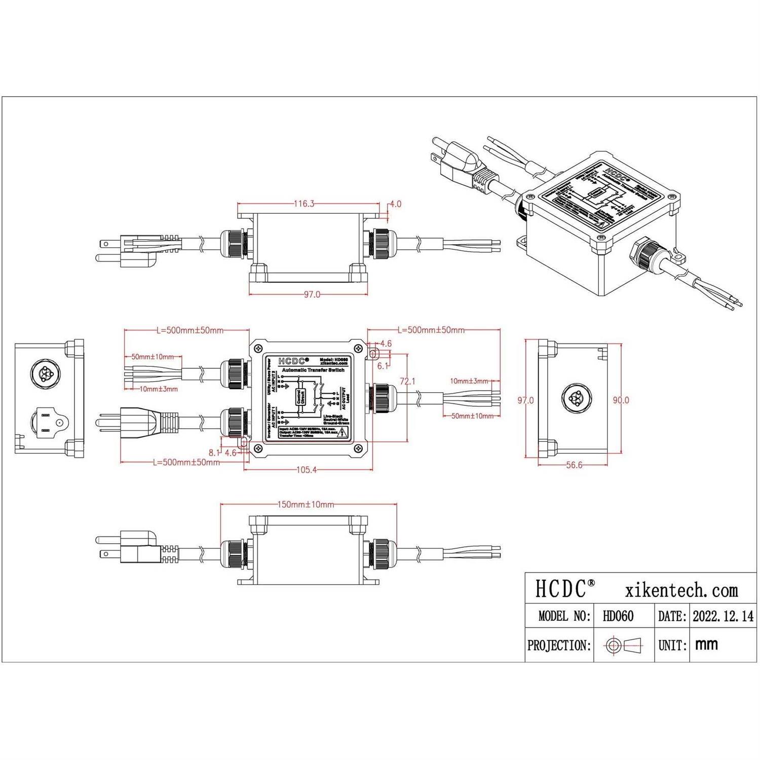 Transfer Switches by HCDC. Details:1, HCDC HD060 Automatic transfer switch, an easy to mount 15Amp inline transfer relay provides switching between AC INPUT 2 (Utility or Shore Power) and AC INPUT 1 (Inverter or Generator) AC source. When AC INPUT 2 is powered, the load power will be switched to AC INPUT 2. When AC INPUT 2 is powered off, the load power will be switched to AC INPUT 1. 2, Operating voltage AC 90 to 135V 50/60Hz. Maximum current 15 Amp. 3, Transfer time less than 30mS (0.03 second). For most smart devices or computers, the switching action of 30mS time will not affect their normal operation. 4, Internal four high power SPST relays switch design, effectively avoid the problem of DPDT relay high inductive load arcing. Live and Neutral wire are switched at the same time. The Ground wires of the two inputs and output are connected together internally and will not follow the switch on and off. 5, IP68 Waterproof high level enclosure, suitable for indoor or outdoor use….