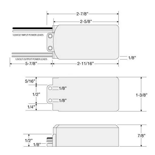 Under cabinet Electronic 60watt bare wire replacement transformer. 120volt input, 12volt AC output. Compact easy to use design. Perfect for lighting applications. Dimmable with standard electronic dimmer. Similar to WAC-Lighting-EN-1260-R-AR. and the High-Tec Electronic Products part number TMO60S 120 20-60W E235548 transformer, SL-518 Super small 120volt to 12volt AC completely encapsulated transformer. Output at 60watts max including line loss. Do not overload. Similar to/ and should work as a replacement for the following, check the physical size to insure it fits the space you have to mount it. Simlar wtih two wires in (black/White) and two output wires 12v AC. WAC-Lighting-EN-1260-R-AR. High-Tec Electronic Products part number TMO60S 120 20-60W E235548 transformer, SL-518 Ortek model CK-1260b-1 Novitronix 9801AR Wang House Model WH-601E6A-3B, OrTek110v to12v 60W, Kichler K1058wt transformer Electronic DR16S black transformer IF in doubt send us a photo