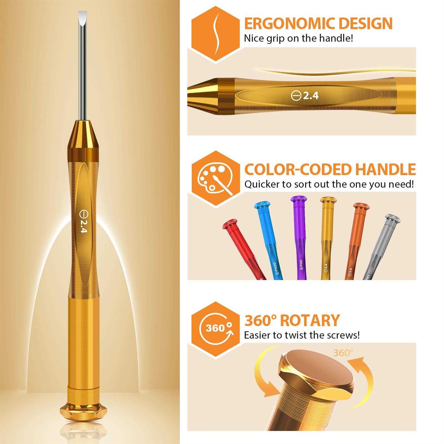 Features and benefits: HELEMAN Precision Screwdriver Kit is a high-quality pocket tool kit with a chrome vanadium alloy tip at the tip of the screw driver’s small set.The handle is made of aluminum alloy and the surface is coated with a color alloy.HELEMAN small screwdrivers are durable and corrosion resistant and is suitable for use with screws of various materials. HELEMAN has two types of Phillips heads and flat head screwdrivers to meet a variety of disassembly/fastening needs which can be fixed or installed. The micro precision screwdriver features an ergonomic trilobal non-slip handle that prevents blistersprovides positive torque and is comfortable to hold. Each tiny screwdriver is available in a different colorbeautiful in appearance and easy to identifyso you can quickly find the micro screwdriver kit you need in use. The cover of handle is made from non-slip materials you don’t have to worry about slip when you use the handle. And end of the handle is rotatable. Twisting screws become easier. Package Includes: 3 x Philips (ph00mm ph0mm ph1mm for each set) 3 x Flathead (2.0mm 2.4mm 3.0mm for each set) 1x Magnetizer 1x Friendly 24-hour free phone service!