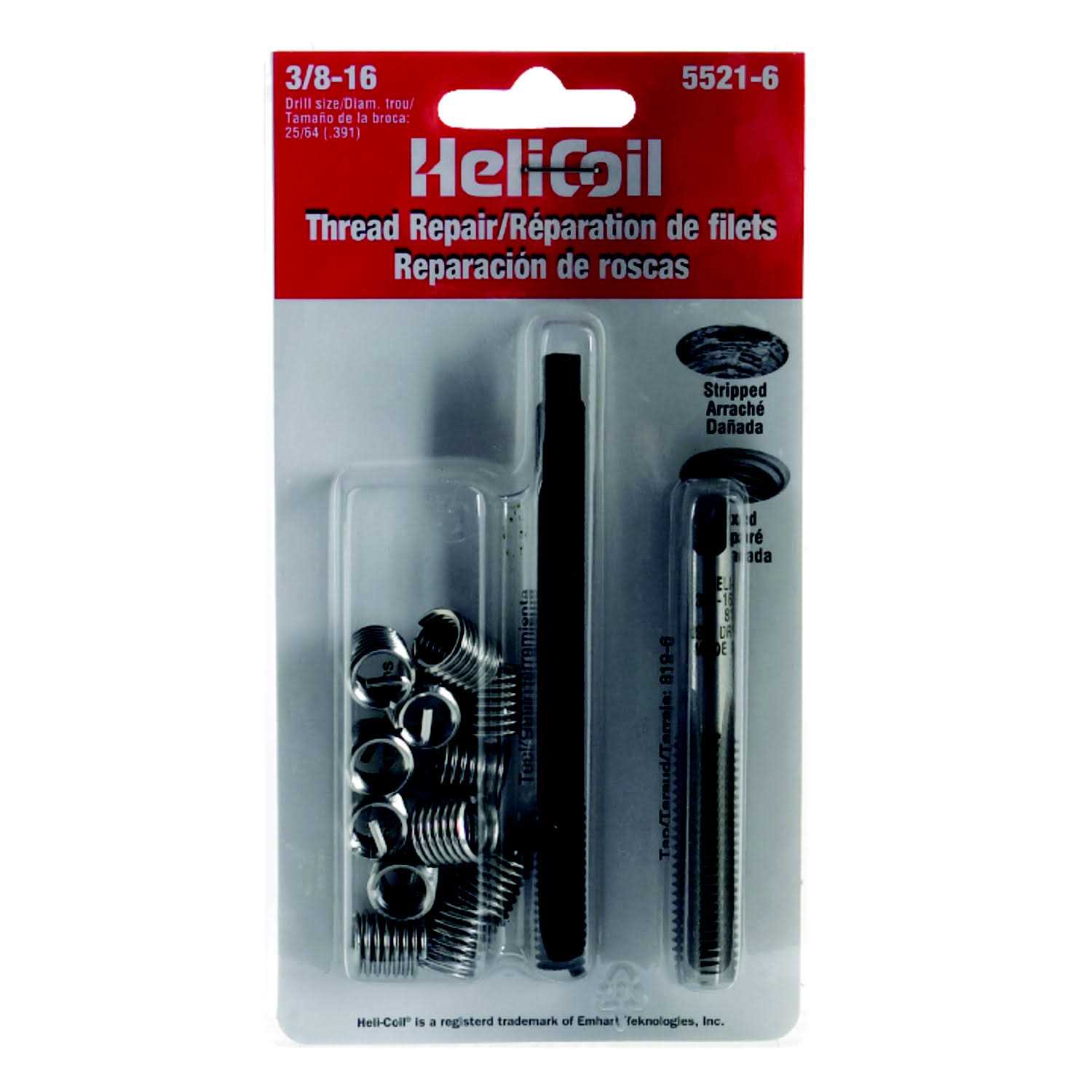 Quickly and permanently restores stripped, worn or damaged threads to their original size and condition. The hard, stainless steel (18-8) diamond shaped wire inserts work in just about any part or material, aluminum, magnesium, cast iron, bronze, etc. The insert has a driving tang for installation which is notched for easy removal. Kit contains a Heli-Coil tap, installation tool, a quantity of inserts and detailed instructions, packaged in durable placon or vinyl pouches.