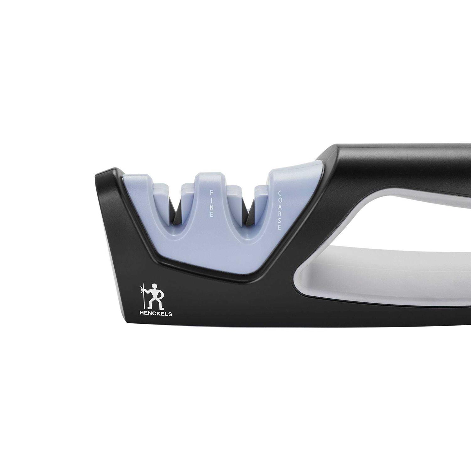 The handy J.A. Henckels International Handheld Knife Sharpener offers a simple solution to knife care. Featuring both coarse and fine ceramic grits, you can maintain the sharp edge of your blade in one innovative tool. Labeled for easy use, the sharpener has an easy-to-hold handle that is contoured for comfort.Suitable for both left- and right-handed use, safety features include a unique grip that keeps fingers away from the knife blade and a non-slip rubberized bottom for stability. With this handheld knife sharpener, caring for your knives has never been easier. And longer-lasting knives make for happier home chefs.Henckels International makes essential kitchen tools that every home chef needs. Each product offers high quality at an exceptional value. Created in 1895 by Zwilling J.A. Henckels, this value-driven brand guarantees the same durability, design and ease of use for which the global company is known. Equip your kitchen with expertise with Henckels International.