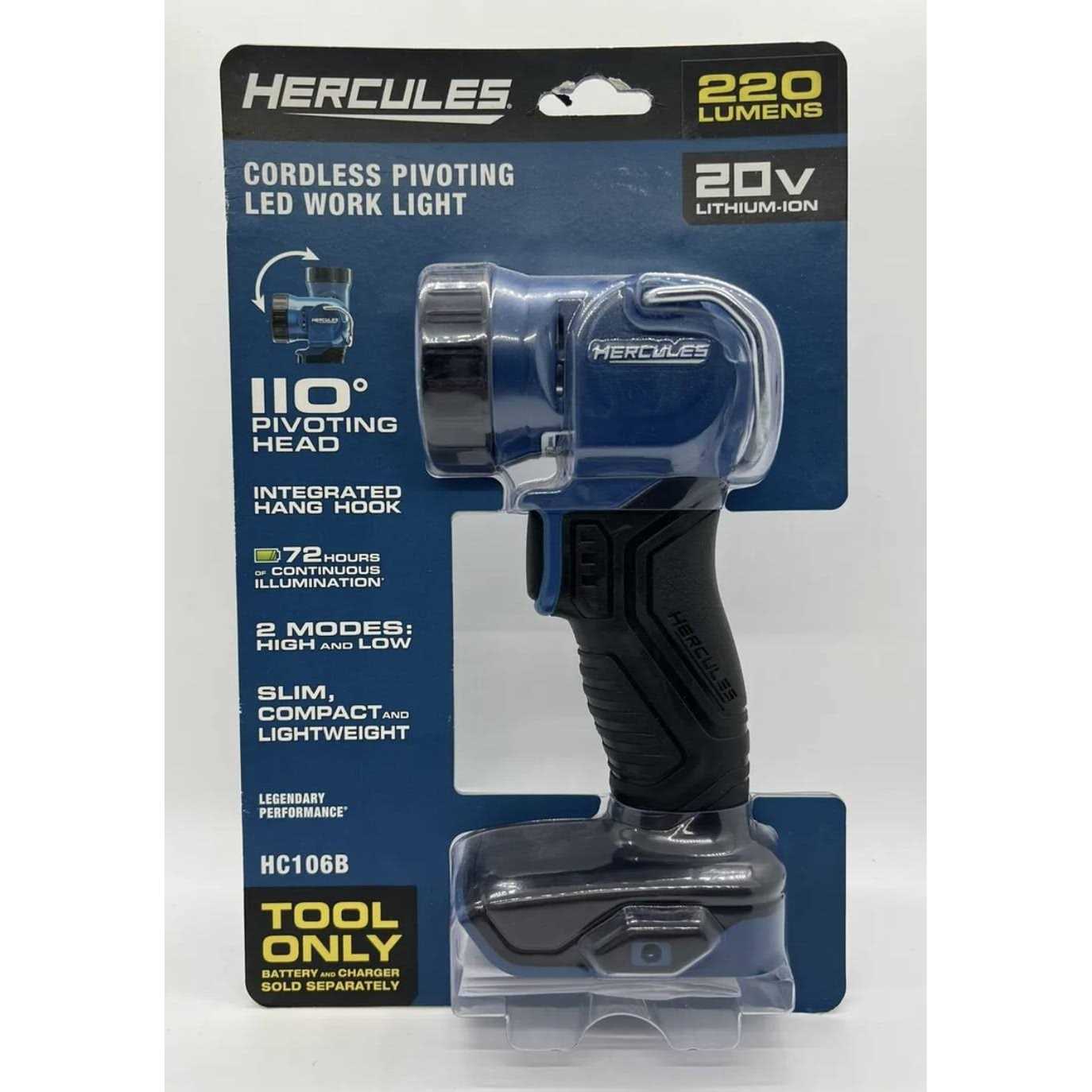 The HERCULES 20V Cordless 220 Lumen Work Light is a sturdy, portable light source that works with the HERCULES 20V battery system. This versatile work light has a 110° pivoting head for perfect light placement. The light works in two modes, high and low. Using the 5.0Ah HERCULES battery, this work light delivers up to 72 hours of continuous light. An integrated hang hook allows this light to be easily positioned. Powered by the HERCULES 20v Lithium Ion Battery Platform, battery and charger sold separately.