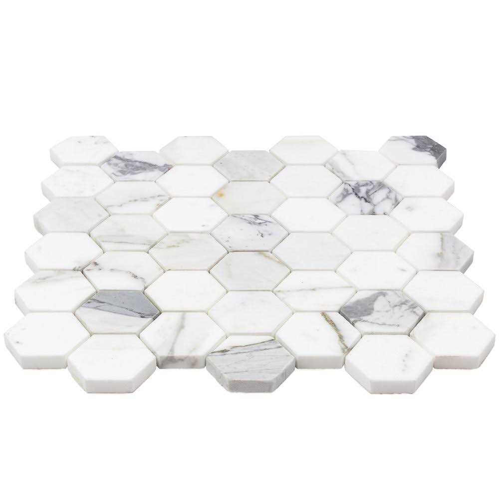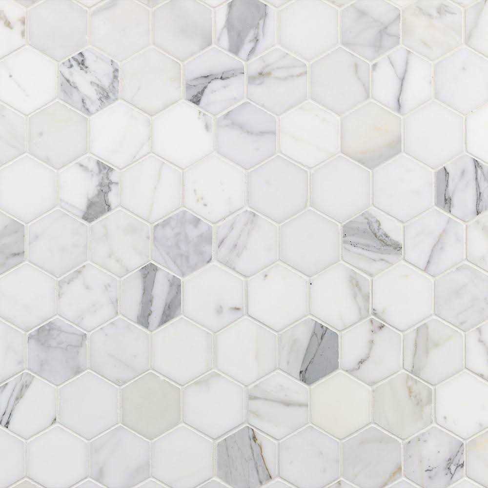 Ivy Hill Tile The beauty and mercurial nature of Hexagon Marble Mosaic Tile in White/Grey make it one of the most sought-after and utilized marble stones. Calacatta bridges modern and classic design and that line of thought went into the design of mosaics. The contrast between the grey veining and undertones on a field of white emits a timeless charm. Mosaics are suitable for wall and floor installation.