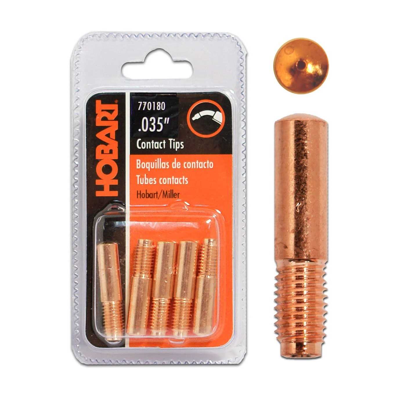 Hobart 0.035″ MIG contact tips compatible for use with millermatics, hobart handler 135 and 175, hobart ironman 250, later hobart beta-MIG 1800 and 2510 welders. Product style contact, works with select hobart welders, product type tips, size 0.035″.