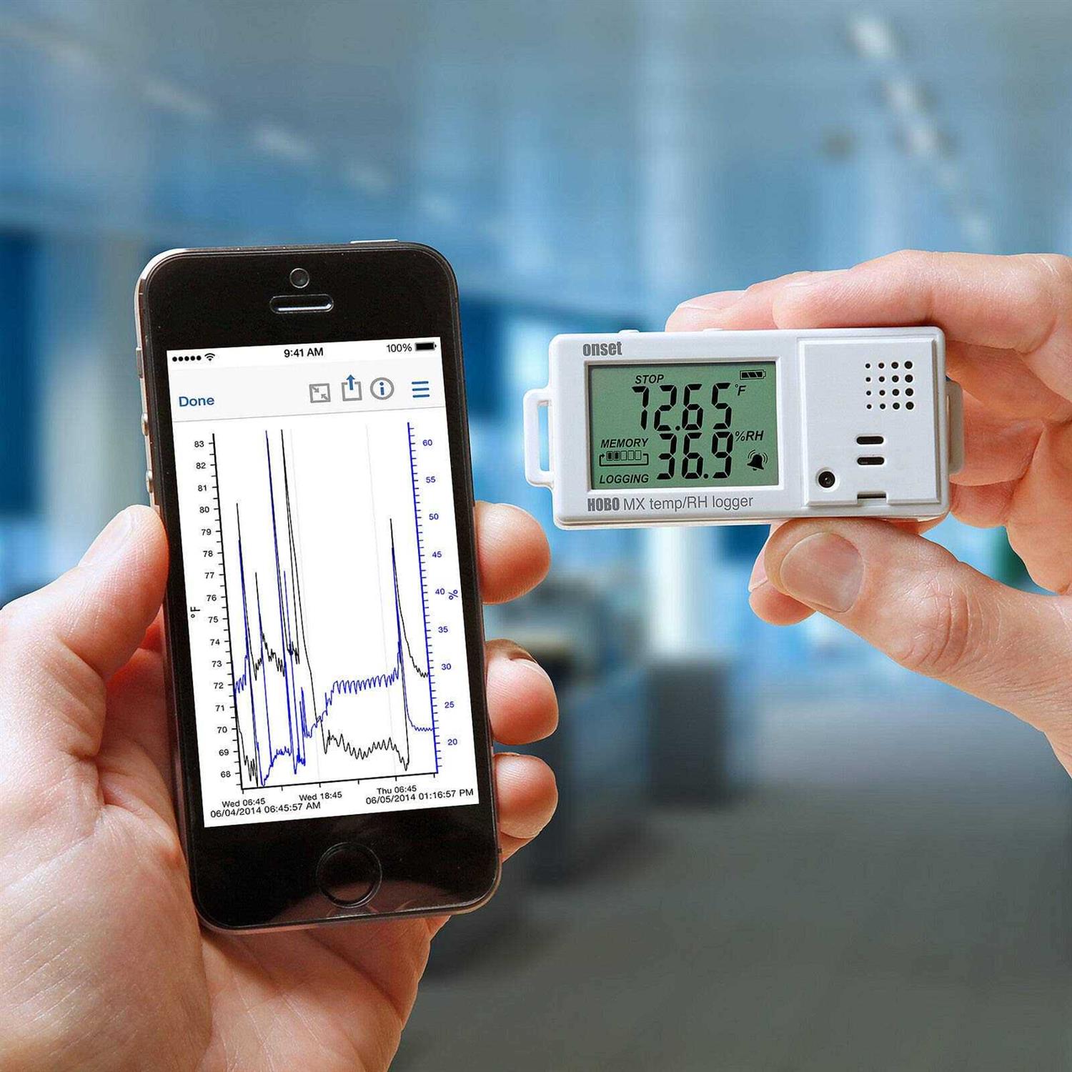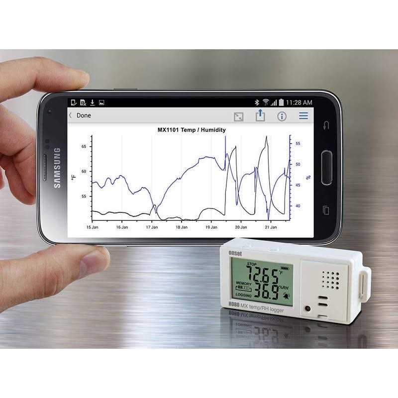 The MX1101 is a data logger with internal sensors for measuring and recording ambient humidity and temperature readings. The data logger uses Bluetooth Smart LE Communications to wirelessly transmit the recorded readings to an Android or iOS (iphone, ipad, etc.) devices. The MX1101 has a -20C to 70C and 1% to 95% RH Measurement range with a +/-0.21C and 2% RH Accuracy. The Onset HOBO MX Series data logger also features user-replaceable AAA Alkaline Batteries with a typical 1 year life, stores up to 84,650 total readings internally when bluetooth communications not available and lcd display. The HOBOmobile app is available for download from the app stores. Each purchase includes command strip, double-sided tape, hook and loop strap and (2) AAA Alkaline batteries.