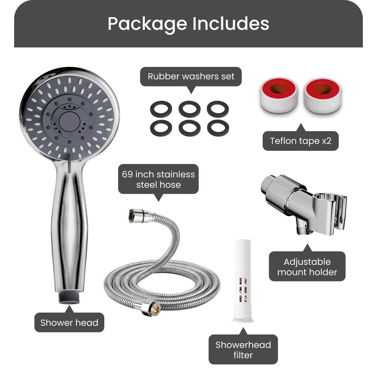 Elevate Your Shower: Our advanced filtered shower head offers a luxurious, spa-like experience and effortless tool-free installation; featuring a 3-stage mineral filter for hard water High Pressure Water Flow with 5 modes: Personalize your shower experience and transform your bathroom into a private spa with filtering showerhead for hard water All-Inclusive Premium Shower Kit: Comprehensive set includes a shower head with filters, filter, 69″ stainless steel hose, adjustable bracket, and bonus 2 sets of Teflon tapes and rubber washers; enjoy effortless installation, elevated aesthetics with our shower head set Durable and High Quality Materials: Crafted with ABS chrome, ABS plastic filter, 100 % rust-proof stainless steel hose, sturdy brass ball, and PTFE teflon tapes, our filtered shower head is designed with superior materials for lasting performance Grab Healthier Showers with Our Hard Water Filter Softener: Our innovative fluoride filter system promotes healthier skin and hair; powerful filtration, sleek design, easy installation, ultimate relaxation – our shower head is your personal at-home spa Refresh your daily routine with the Hofnie Filtered Shower Head. This top-tier shower head is engineered to combat the harsh effects of hard water, providing a clean, invigorating shower each time. Say goodbye to issues like mineral buildup, dry skin, and dull hair – and welcome a revitalizing shower experience that leaves you feeling clean and refreshed every day. Installation couldn’t be easier. Our process is straightforward, tool-free, and takes just some seconds. Once installed, you can easily adjust the shower head pressure and switch between modes to tailor your shower experience to your exact preferences. Our shower head offers five luxurious functions: spray, pulse, mixed, rainfall, and massage. Switch between modes seamlessly to match your mood or needs. From a gentle, tropical-like shower to a robust, full-body rinse, you have full control over your shower experience. Our universal shower head is designed to fit any plumbing system and includes everything you need for installation: a 69″ stainless steel hose, an adjustable bracket, and 2 sets of teflon tapes and rubber washers. This ensures a secure, leak-free setup that’s easy to handle. Our shower head features a chrome-plated head and a rust-resistant hose, both designed to resist tarnishing and mechanical damage. Along with a durable filter, these elements work together to ensure a flawless shower experience that lasts for years to come. The sleek, modern design of our shower head adds a touch of luxury to any bathroom, making your daily shower more than just a routine – it’s a true experience. Embrace the Hofnie difference. Customize your shower with our filtered shower head, and immerse yourself in comfort and relaxation