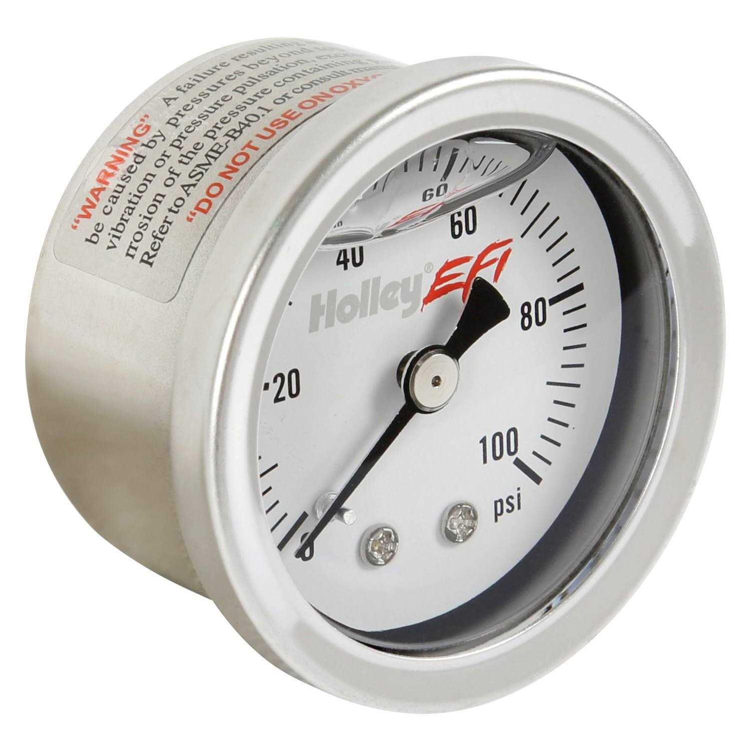 The Holley EFI analog-style gauge is designed specifically for use with EFI systems. The 0-100 psi gauge is Glycerine (oil) filled for added durability in applications where vibration or pulsation is present. The stainless steel case and bezel creates a finished look to complement your fuel system.