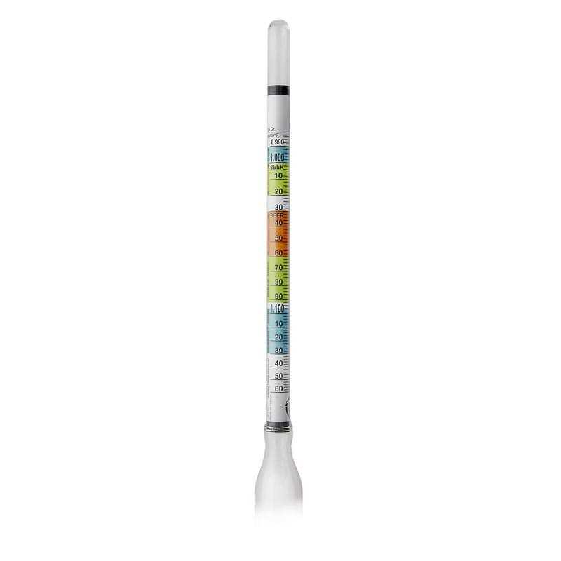 This hydrometer allows you to keep track of your fermentations progress and determine the finished products alcohol content by taking readings before and after fermentation and comparing them. This triple scale hydrometer also allows you to verify when your batch is ready to bottle by showing you the specific gravity scale from 0.990 to 1.170, Balling degrees scale from -3 to +35 and potential alcohol scales -2 to +22%.