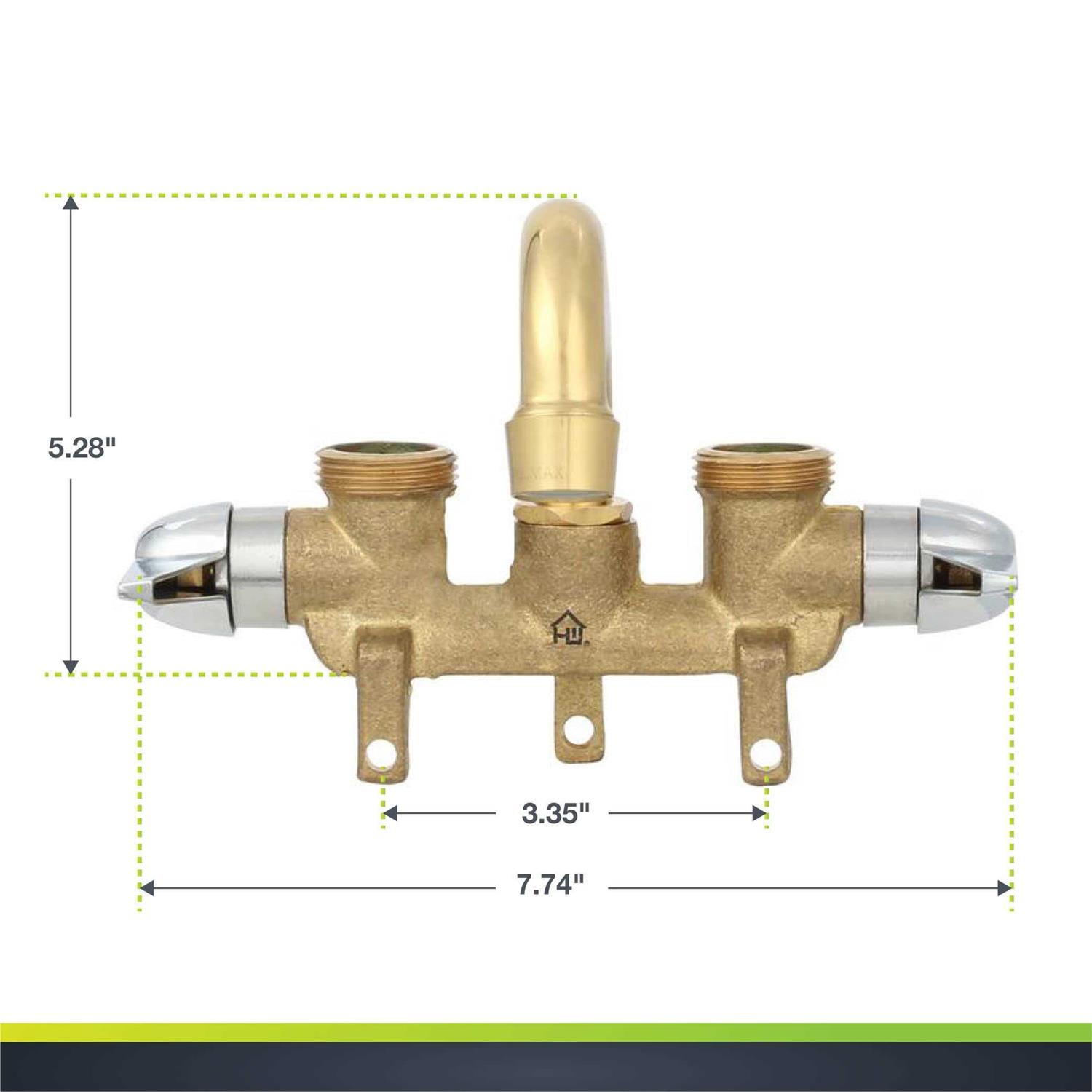 Union inlets are combination 0.5″ threaded or solder installation. Includes both aerator & 0.75″ hose thread adapter for the spout. Quarter turn washerless design, brass waterway, chrome plated handles. Rough brass. Laundry tray faucet. Clamping type mounting with 3″ centers.