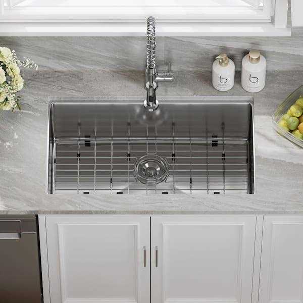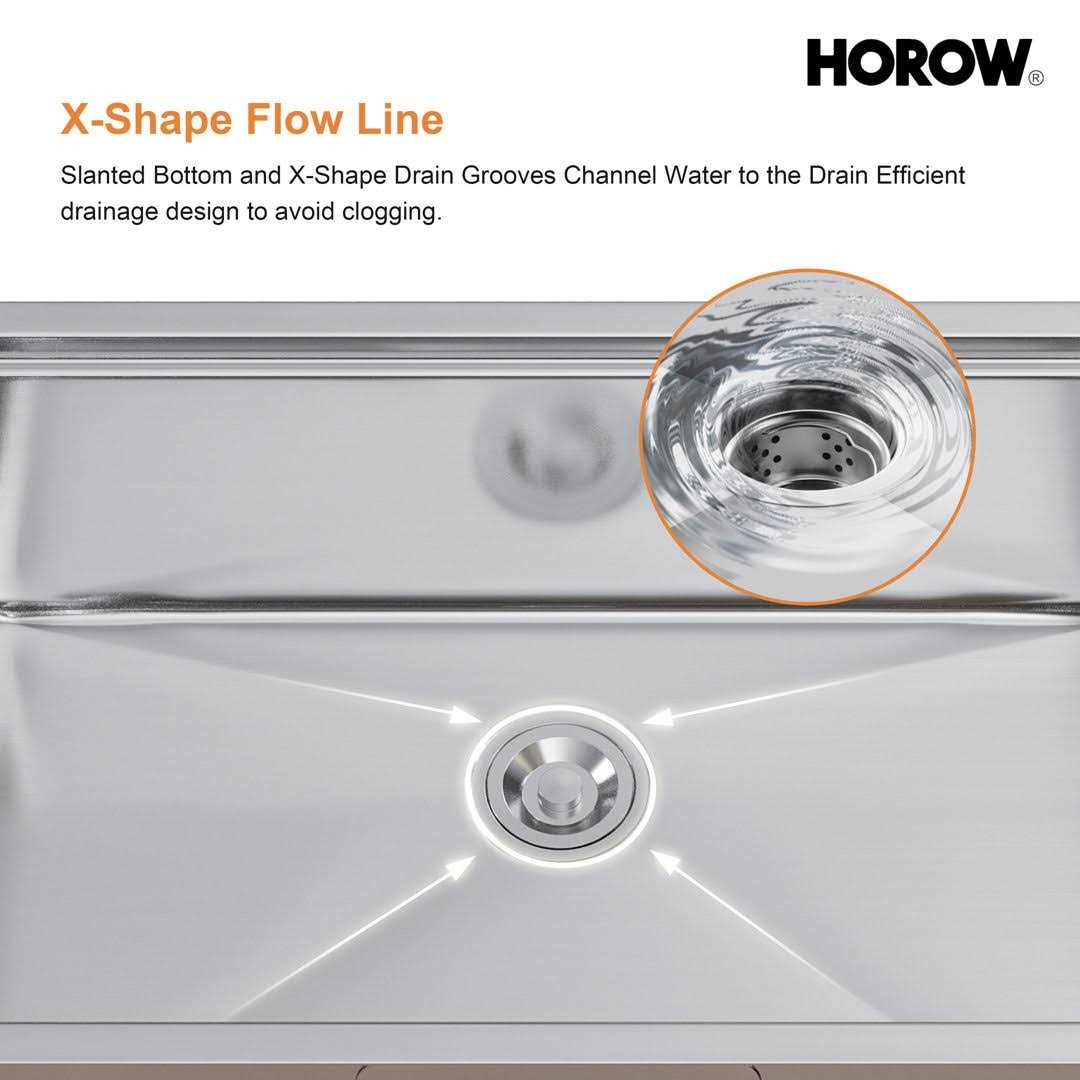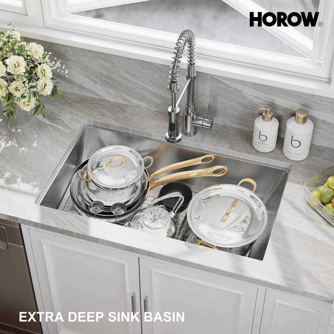HOROW kitchen sinks feature clean lines and tight-radius corners for a streamlined modern look. Undermount design creates a clean transition between sink and countertop with no exposed mounting deck to trap debris. Made with heavy-duty TRU16-Gauge stainless steel for lasting durability, the spacious single bowl sink offers ample space for large cookware and stacks of dishes. Noise sound dampening pads help prevent noise and vibration. Wear-resistant finish and easy-to-clean rounded corners help reduce build-up over time. Channel grooves and a sloped bottom help improve drainage. The sink comes with a protective bottom grid, drain assembly with cover, mounting hardware, and cut-out templates.