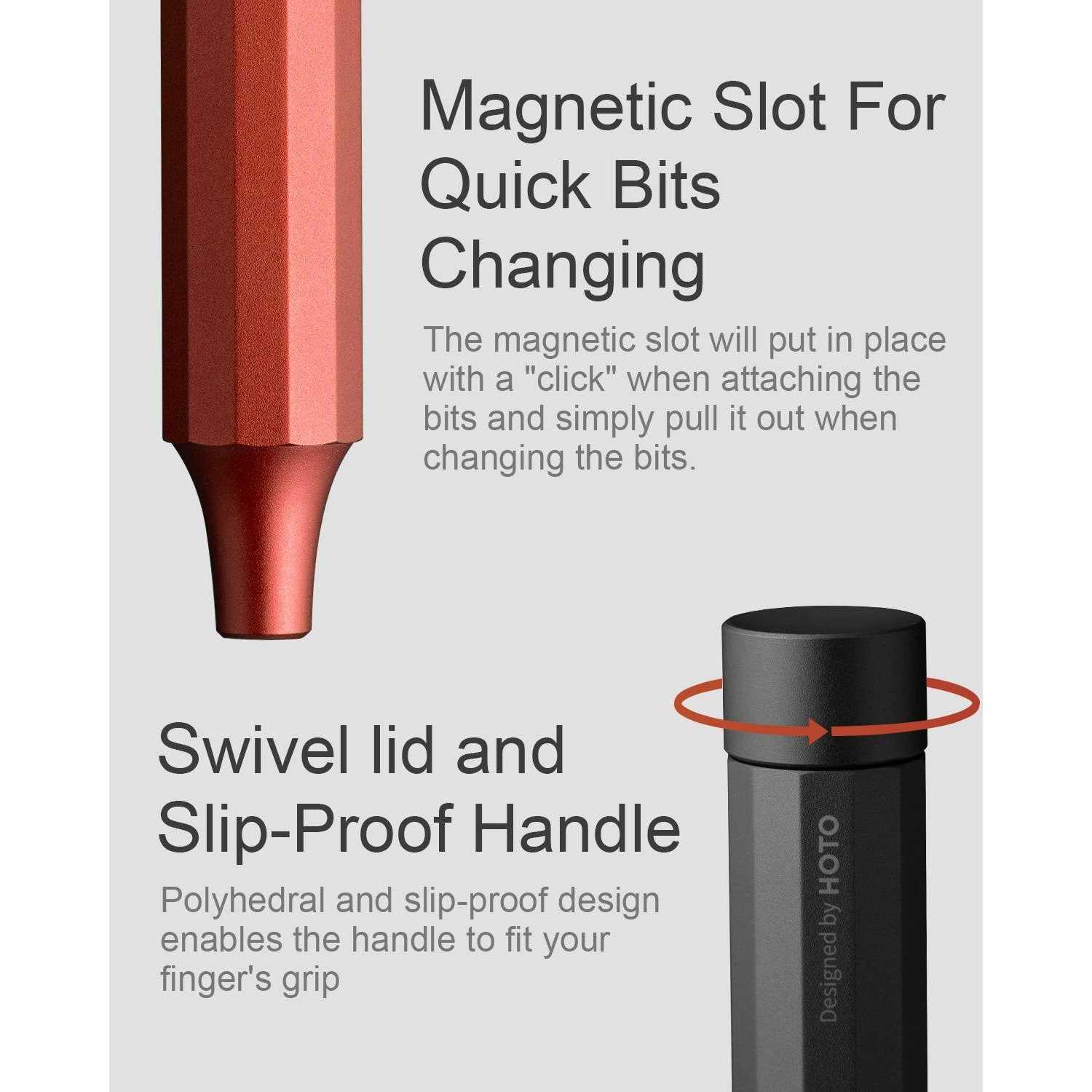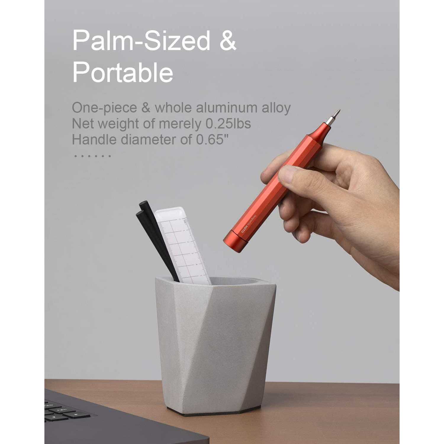24-IN-1 BITS SET MEET YOUR DAILY REPAIR NEEDS: HOTO mini screwdriver set included the most common use size for electronics, glasses, bracelets, and as well as larger appliances, which completely fulfilled your need for precise & accurate work.Size included: Philips(PH000/PH00/PH0/PH1), Flat blade(SL1.5/SL2.0), Hex(H1.5/H2.0/H2.5), Torx bit set-without hole(T2/T3/T4/T5/T6/T8/T9/T10), U-shaped(U2.6), Y-shaped(Y0.6), W-shaped(W1.5), Tri-Wing(TW1), Triangular( 2.3), Pentagon(P2/P5). TOUGH S2 STEEL BITS WITH ANTI-RUST COATING: The Torx screwdriver set bits build with tough S2 alloy steel and the hardness of the bits can reach 60HRC. It helps to boost higher resilience and strength, in order to enhance durability and do not easily crack. And the anti-rust treatment with eco-friendly nickel helps the bits last for a longer period. SLIP-PROOF WITH ALUMINUM ALLOY BODY: The entire screwdriver made with aluminum alloy in one piece and polyhedral surface enables the handle to fit your finger’s grip for single-hand operation. And the screwdriver lid has a noiseless bearing to enable smooth turning and easy screwing. MAGNETIC BIT STORAGE AND SLOT: All 12 pieces of double-end bits are stored in the magnetic box and hidden within the handle of the screwdriver. The magnetic slot will be put in place with a “click” when attaching the bits and simply pull it out when changing the bits. Convenient to use, store and you won’t lose the bits again. HOTO Tools, as part of Xiaomi’s eco-chain, is a company committed to innovating new lifestyle tools under the philosophy of “Active exploration, enjoyable innovation.”