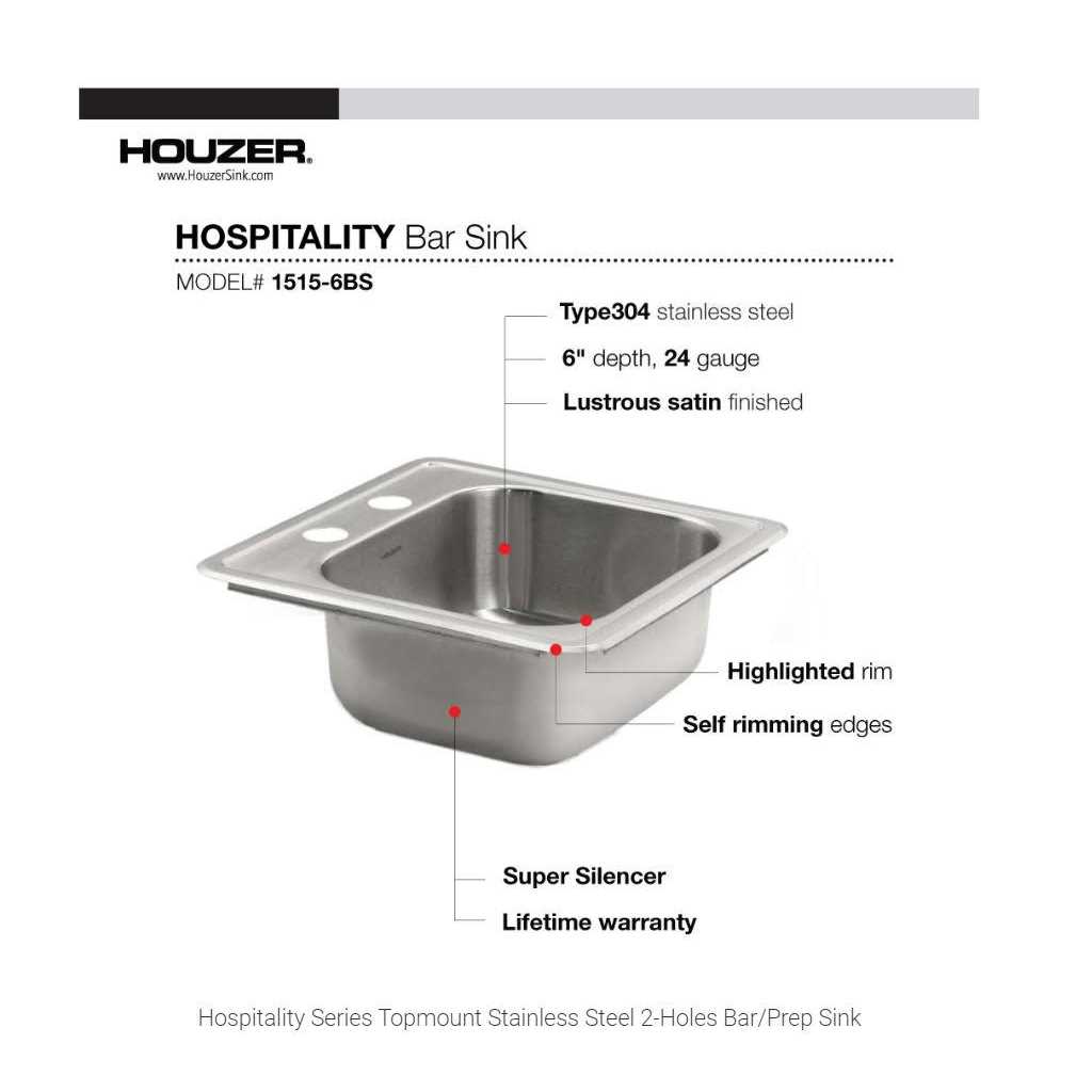 Houzer 1515-6BS-1 Hospitality Series Topmount Stainless Steel 2-Holes Bar/Prep Sink