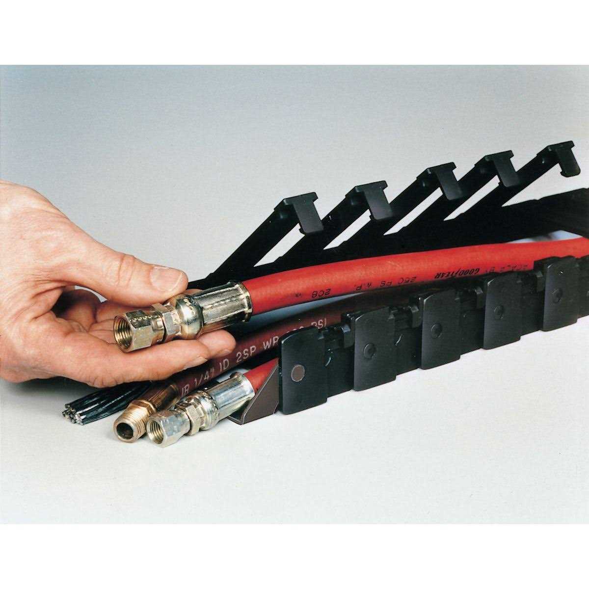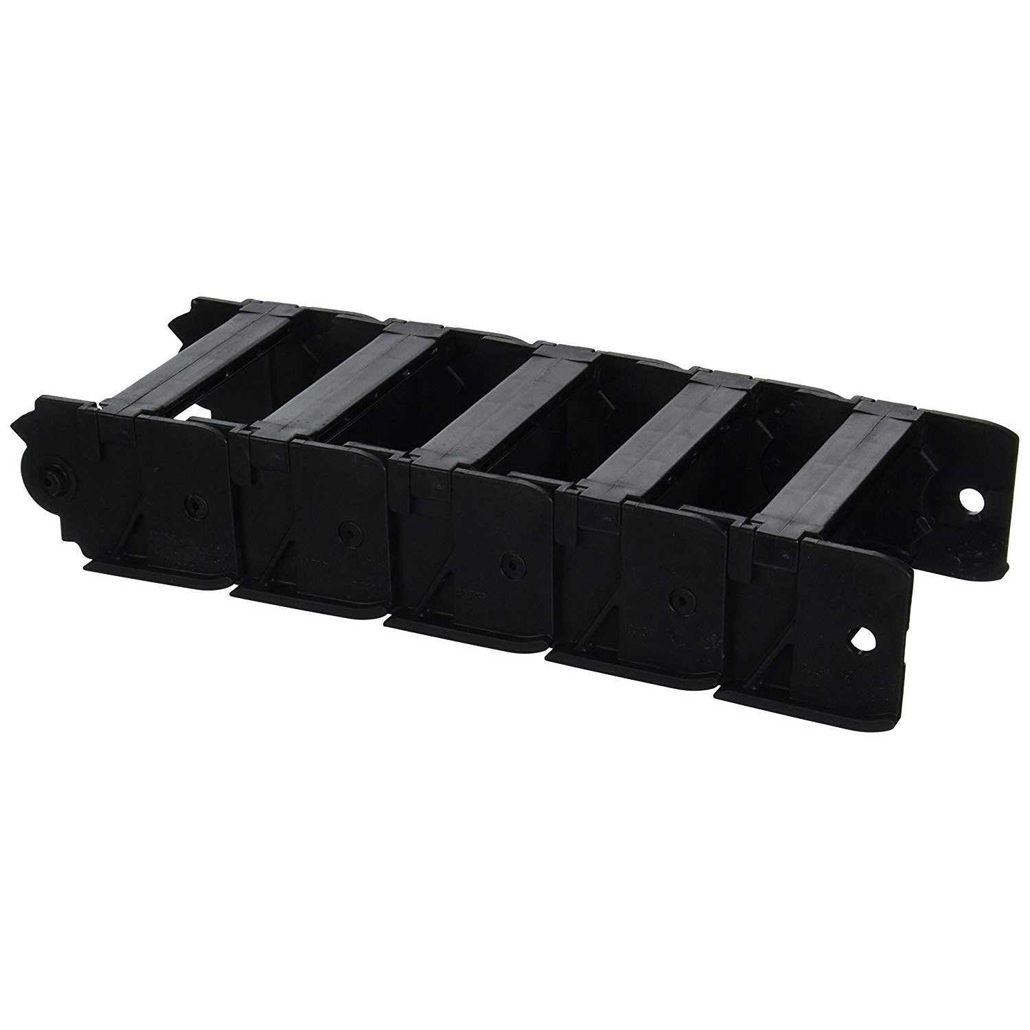 These cable and hose carriers have mounting brackets on either end and hinged, snap-on crossbars that open for access at any point. This allows cable and hose to lay in the carrier cavity, so they don’t need to be pulled through the whole length of the carrier. They also have an open construction, which promotes air flow to prevent heat buildup. These carriers may be extended with carrier link chains. Cable and hose carriers support and protect moving cable and hose in general purpose applications.