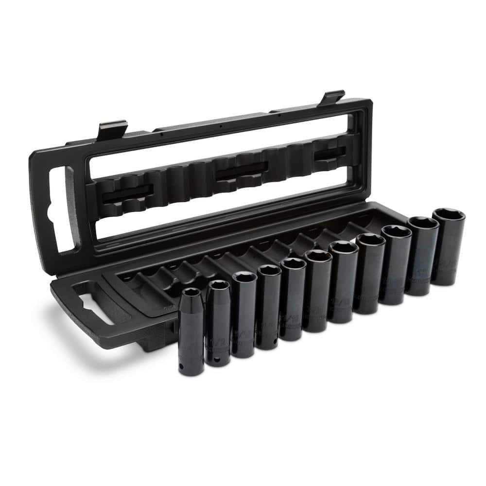 The Husky 1/2 in. drive deep impact socket set features sockets that are forged from chrome molybdenum alloy steel (Cr-Mo) and designed to withstand rigors of heavy-duty auto and industrial use. Size markings have been hard stamped into the sockets for quick and easy identification that will never wear away. These impact sockets also feature off-corner loading which helps prevent fastener rounding, plus a pin hole at the base of each socket for use with pin for a secure attachment to drive tools. An oiled, black oxide finish gives you maximum corrosion resistance.