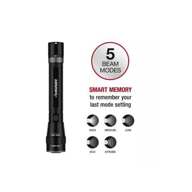 The Husky 5000-Lumens Dual Power Rechargeable Flashlight provides brightness and extreme long life. This 5-light mode flashlight brings superior optics and color. The twist focusing makes switching from spot to flood a simple twist. Included is a rechargeable battery for super long-life, which can be charged without removing the battery. Also included is a USB C charging cable for super-fast charging. The Husky 5000-Lumens Dual Power Rechargeable Flashlight can also be powered by 9 AA alkaline batteries (not included). This rechargeable flashlight is impact resistant, weather resistant and virtually unbreakable. Tested and rated to ANSI/FL1 standards.