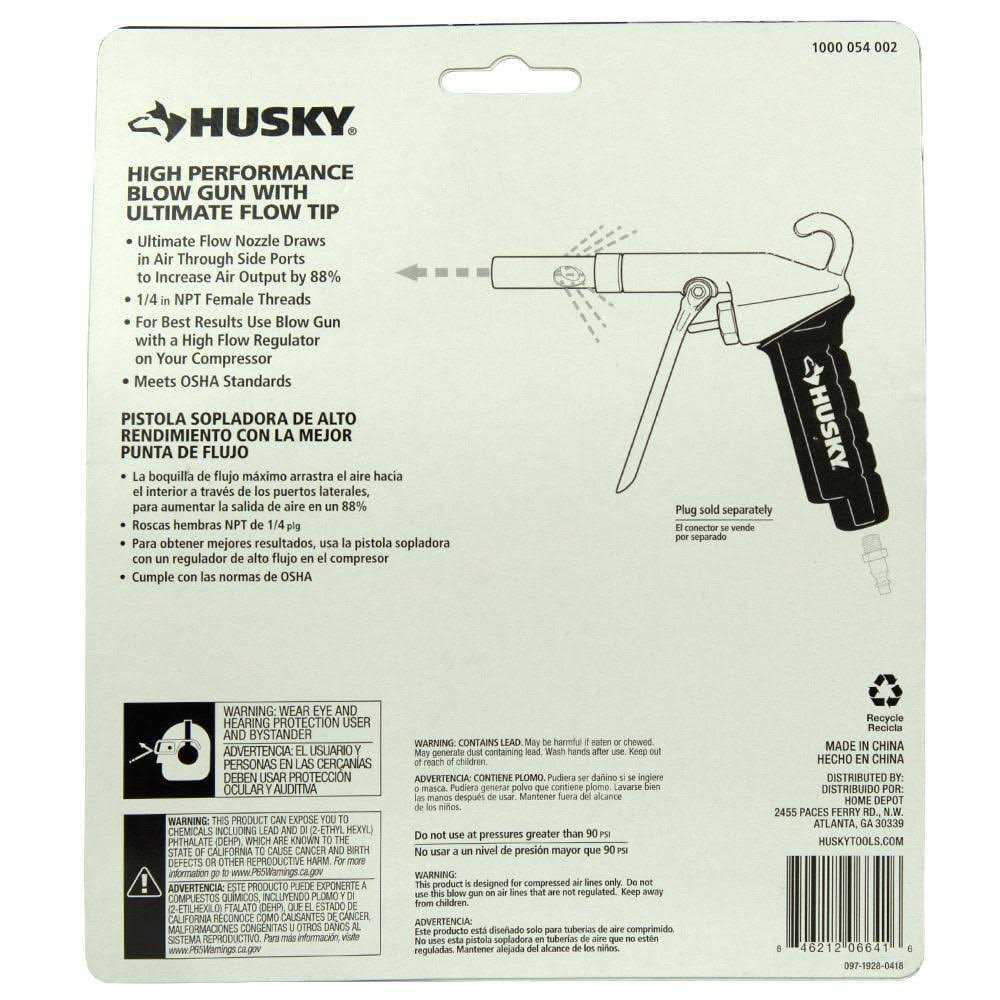 Get the ultimate air flow with this Husky High Performance Blow Gun. This reliable tool delivers 92 SCFM and 88% more air flow than standard blow guns. It comes with a large storage hook for easy access and meets OSHA standards.
