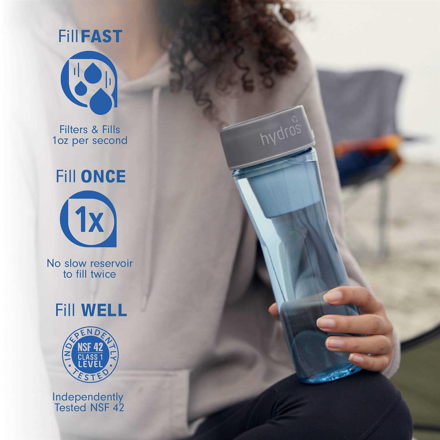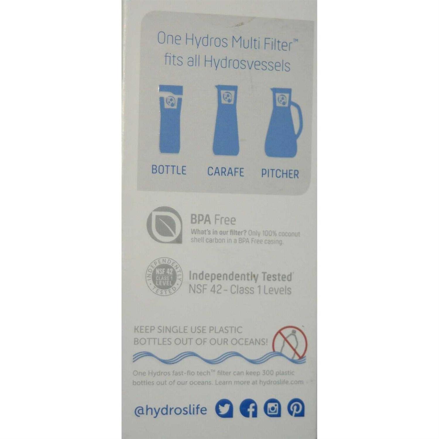 FL17 Powered by fast-flo tech. Fast-Flo modern filtration everywhere. One Hydros Multi Filter fits all Hydros vessels – for easy access to healthy hydration at home and on the go. The Hydros Multi Water Filter reduces the following substances that may be in your tap water. Chlorine (taste and odor). Sediment (Particulate Class 1). The Hydros Multi Water Filter is not intended to purify water. Do not use with water that is microbiologically unsafe or of unknown quality without adequate disinfection before or after the system. Individuals requiring water of special microbiological purity should follow the advice of their doctor. The contaminants or other substances reduced or removed by this water treatment device may not necessarily be in all users water. Independently Tested (The Hydros Multi Water Filter (Model FL17) has been independently tested by a laboratory accredited by the ANSI-ASQ National Accreditation Board against NSF/ANSI Standard 42 for the reduction of claims specified on the Performance Data Sheet. Keep single use plastic bottles out of our oceans. BPA Free: What’s in our filter? Only 100% coconut shell carbon in a BPA Free casing. Designed in California. Responsible made in China.