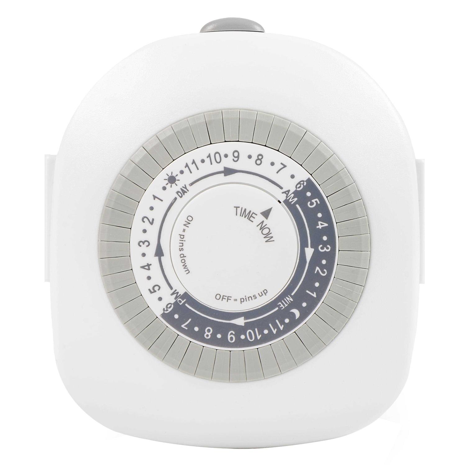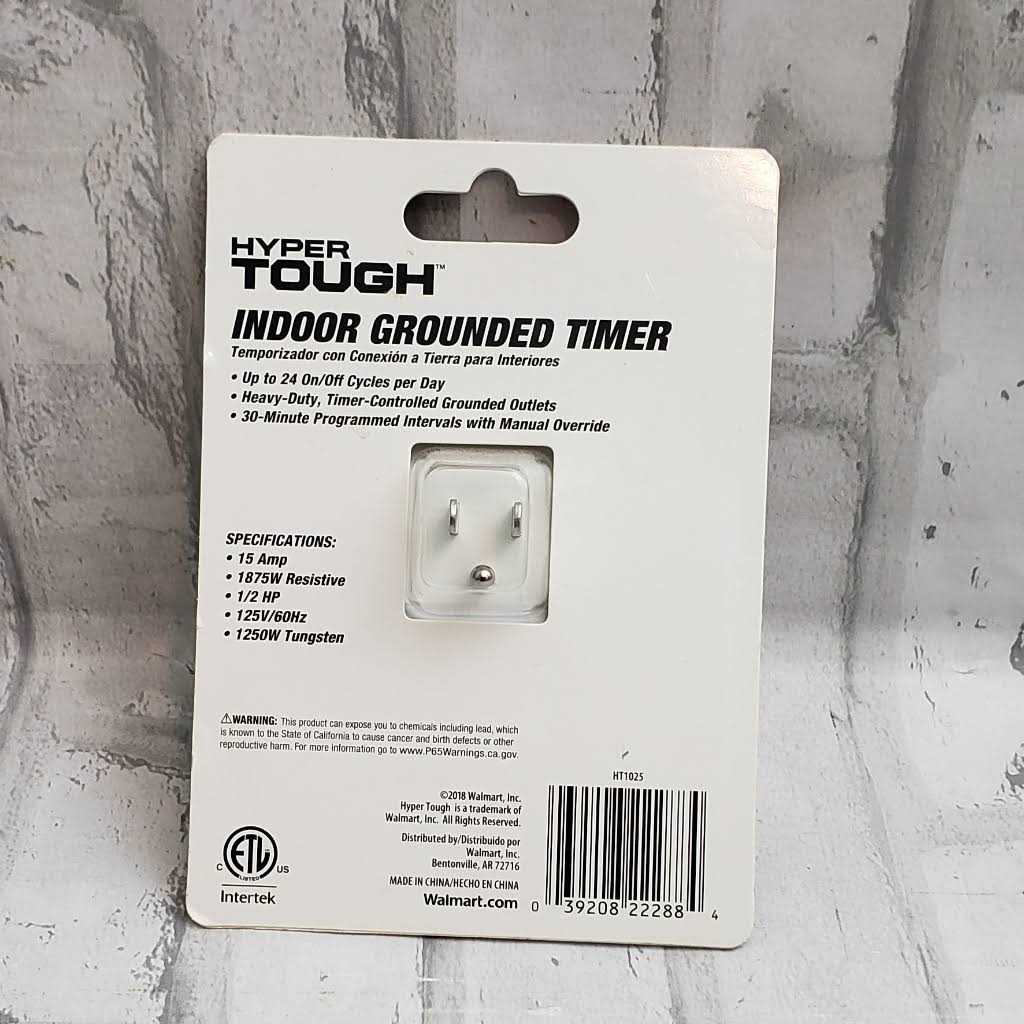 The Hyper Tough Heavy-Duty Indoor Grounded Timer with two, 3- prong outlet will automate your home with on and off set times. Timer is easy to set in 30-minute intervals and provides up to 24 hour on/off setting per day. Pins are easy-to use and built-in for convenience. Push pins down or pull up to set your on and off time. Features a manual override switch. Compatible with CFL and LED.
