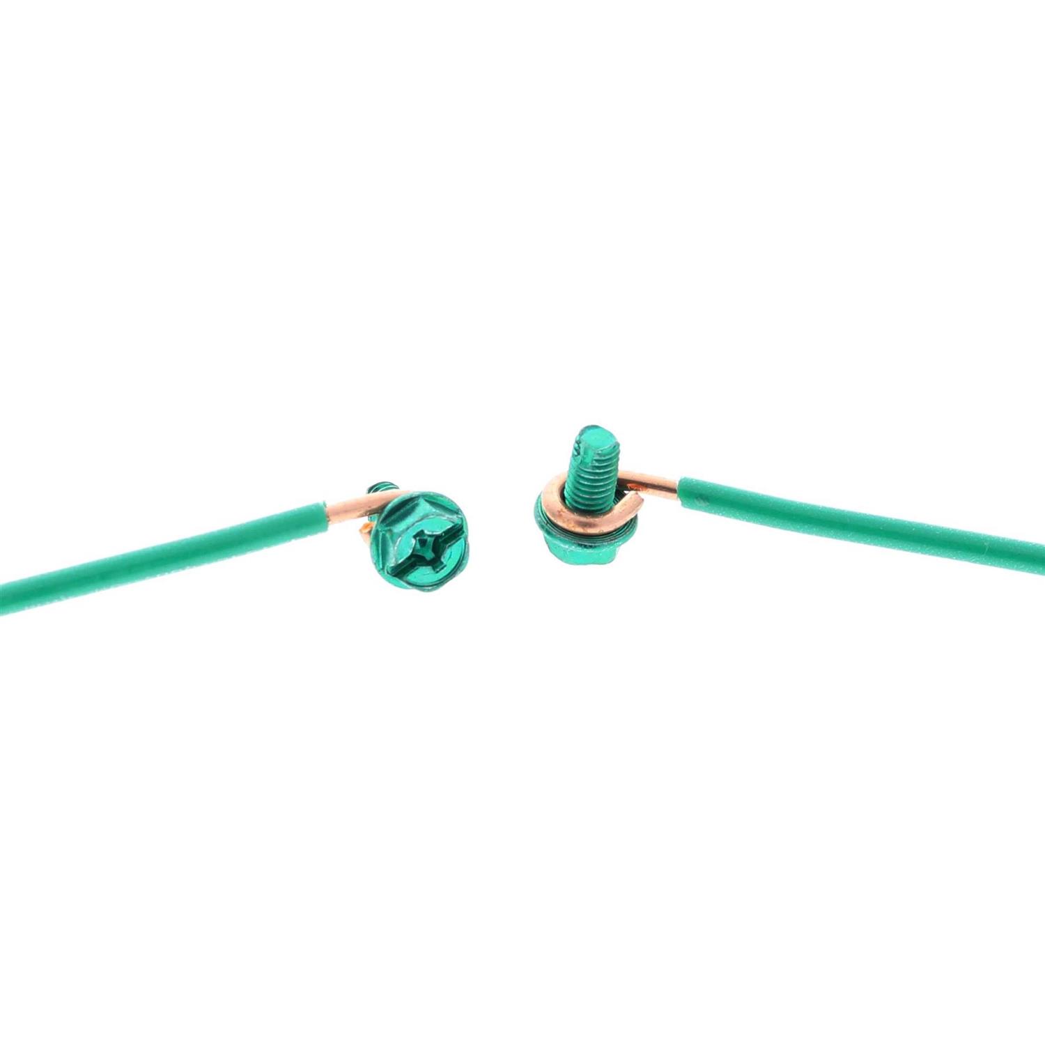 Designed for a wide variety of grounding applications. Safe, fast and convenient for device grounding applications. 8 inch 12 AWG, one end stripped and one end looped to ground screw. Thread forming hole finding ground screw with combination head. Ensures compliance with article 250 of the National Electric Code. Screw includes a combination of hex, Phillips, slotted and Robertson heads. 8 In. lead is flexible for easy positioning in your metal outlet box.