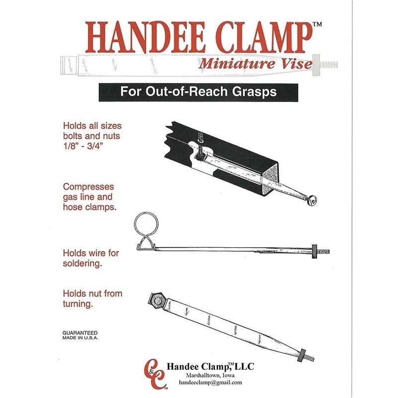 This innovative tool solves the problem of that out of reach grasp. Designed to firmly hold nuts, bolts, and clamps in its easily adjustable jaws, the Handee Clamp is invaluable when working in restricted and hard to reach places.