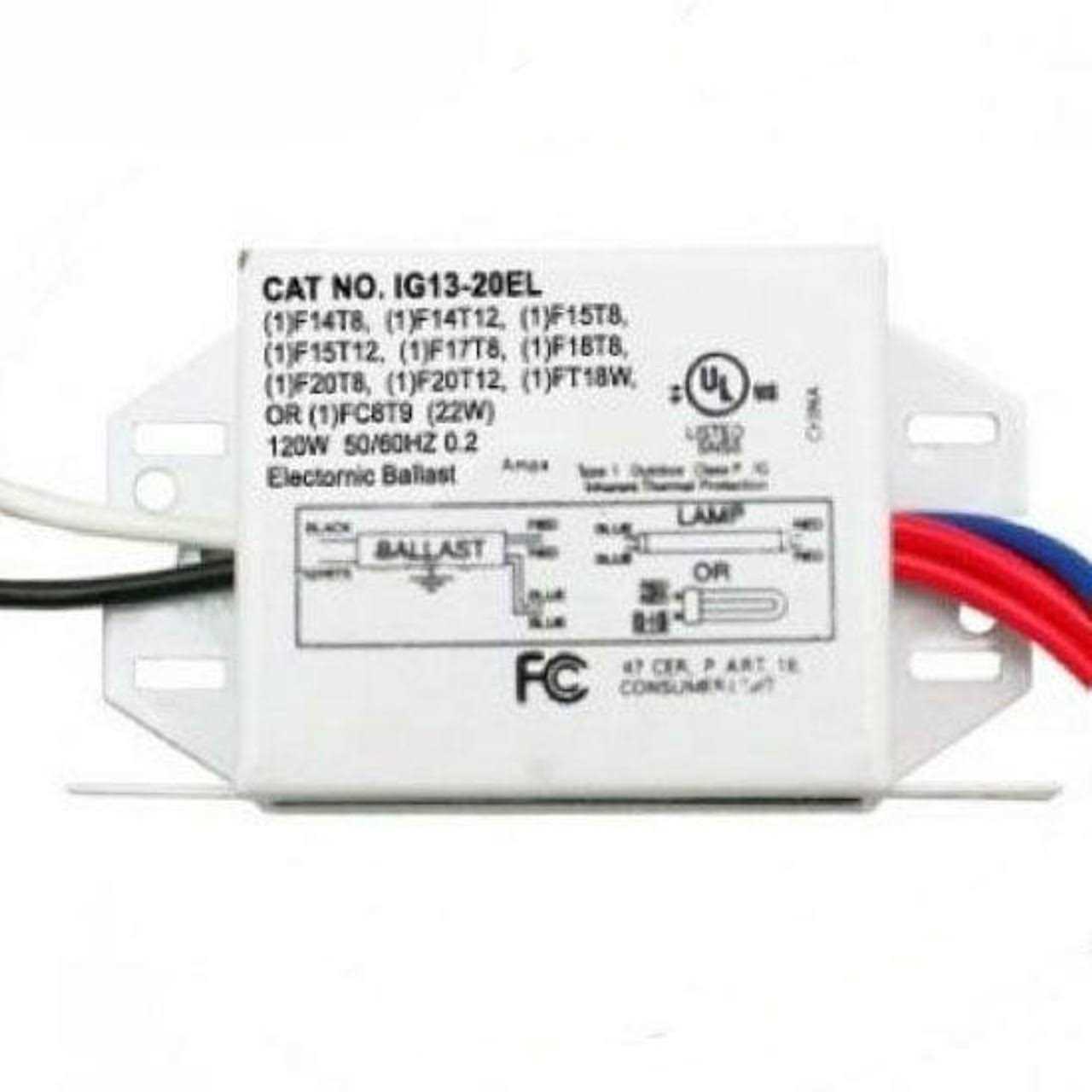 Inter-Global Electronic Programmed Rapid Start Ballast, 120V, operates single F20T12, F15T8, F14T8, F14T12, F15T12, F17T8, F18T8, FC8T9 lamps. – IG13-20EL Spec Sheet – Inter-Global IG13-20EL Electronic Fluorescent BallastFeaturesUL/CUL listed – Class P Inherent Thermal Protection – FCC, 47 CFR, Part 18 Consumer Limits – Type 1 Outdoor, Normal Power Factor120V line voltage – Minimum Starting Temperature: 0oF/-18oCMaximum Case Temperature: 158oF/75oCLead Length blue/red with socket 18″Replaces Robertson RP1420Equivalent replacement for Robertson SS2RC – check specifications