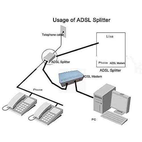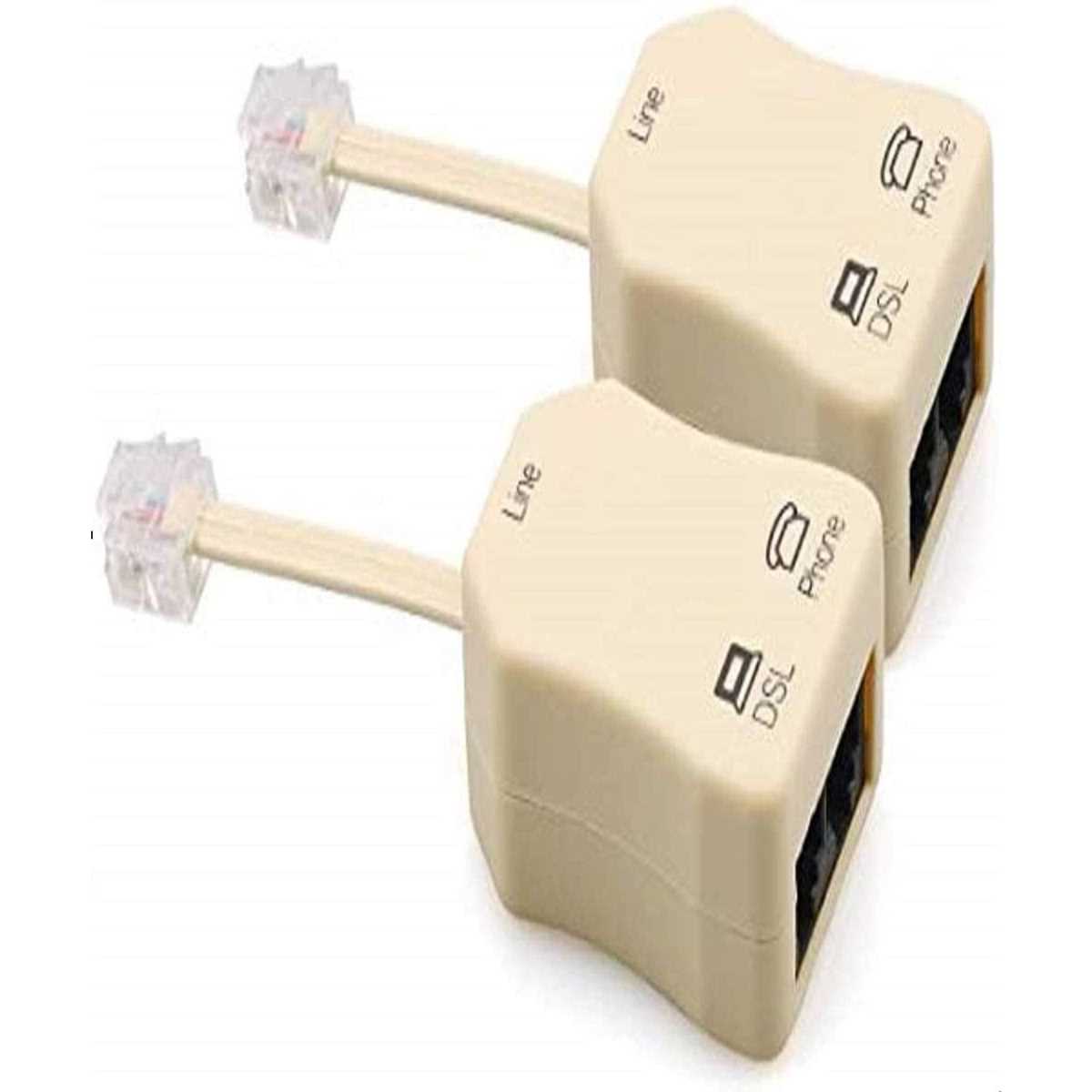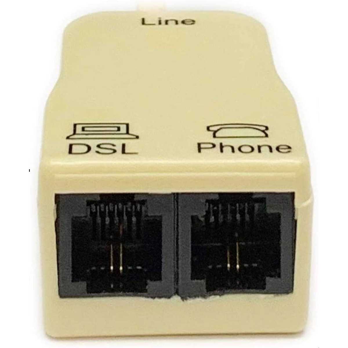 The In-line Adapter connects between the wall jack and voice device (e.g. phone, fax, answering machine, Caller ID) providing both an unfiltered DSL jack for DSL connection and a filtered jack for a single line of voice device communications. Eliminates all erratic impedance from telephone equipment that interferes with DSL communications. Material is flame retardant thermoplastic compliant with UL 94V-0, Minimum of 50 micro-inch of gold and nickel. Small compact design.