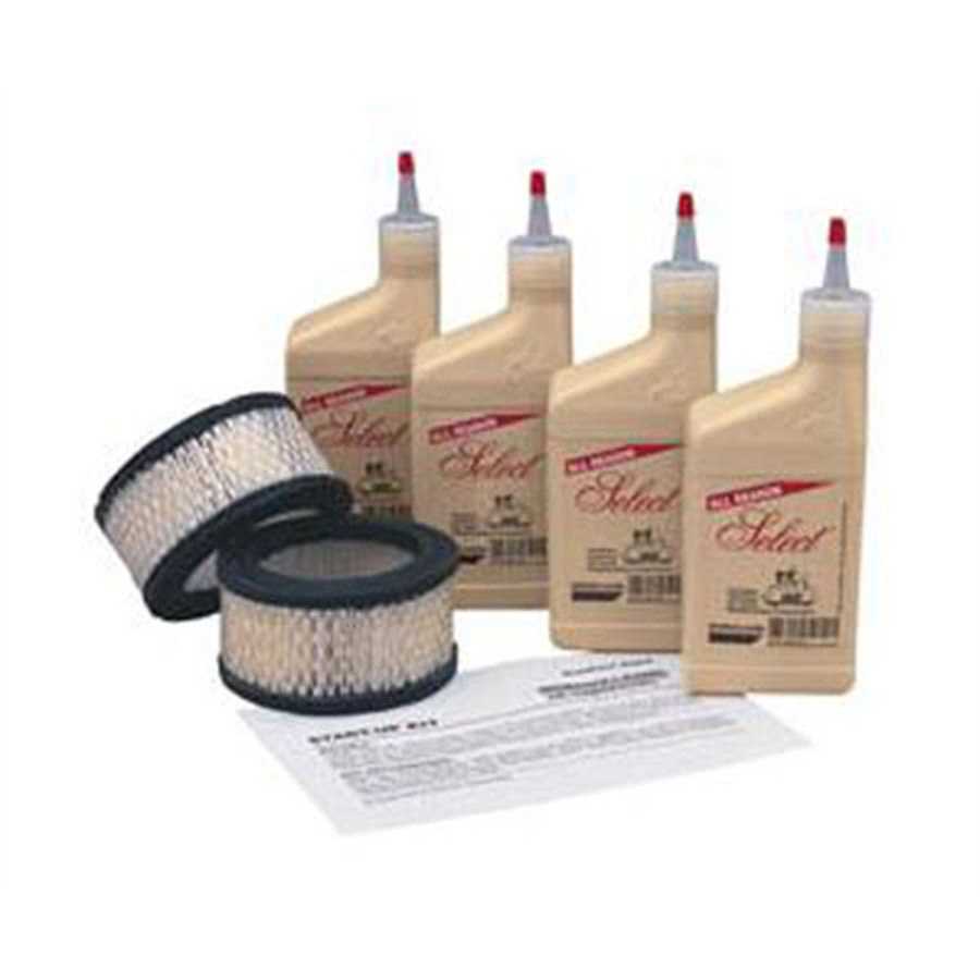 Features and Benefits All-Season Select Lubricant increases efficiency reduces wear and prevents carbon build-up Includes (2) air filter elements replacements and 4-cycle engine oil Replacement filter elements provide extra parts for convenience Designed for 2000 hours or approximately 1 year of operation 2-year extended (pump only) provides peace of mind with proven reliabilityStart-up kits include all the parts needed to maintain your compressor for one year plus the added protection of extended coverage. The start-up kit for IRTC2475F13GH Gas Air Compressor includes: (4) quarts All-Season Select lubricant MSDS sheet and decal and (2) air filter elements replacements and 4-cycle engine oil. Use of the All-Season Select lubricant from commission of the compressor extends the usual 1 year on the pump itself to 2 years. Designed for 2000 hours or approximately 1 year of operation.