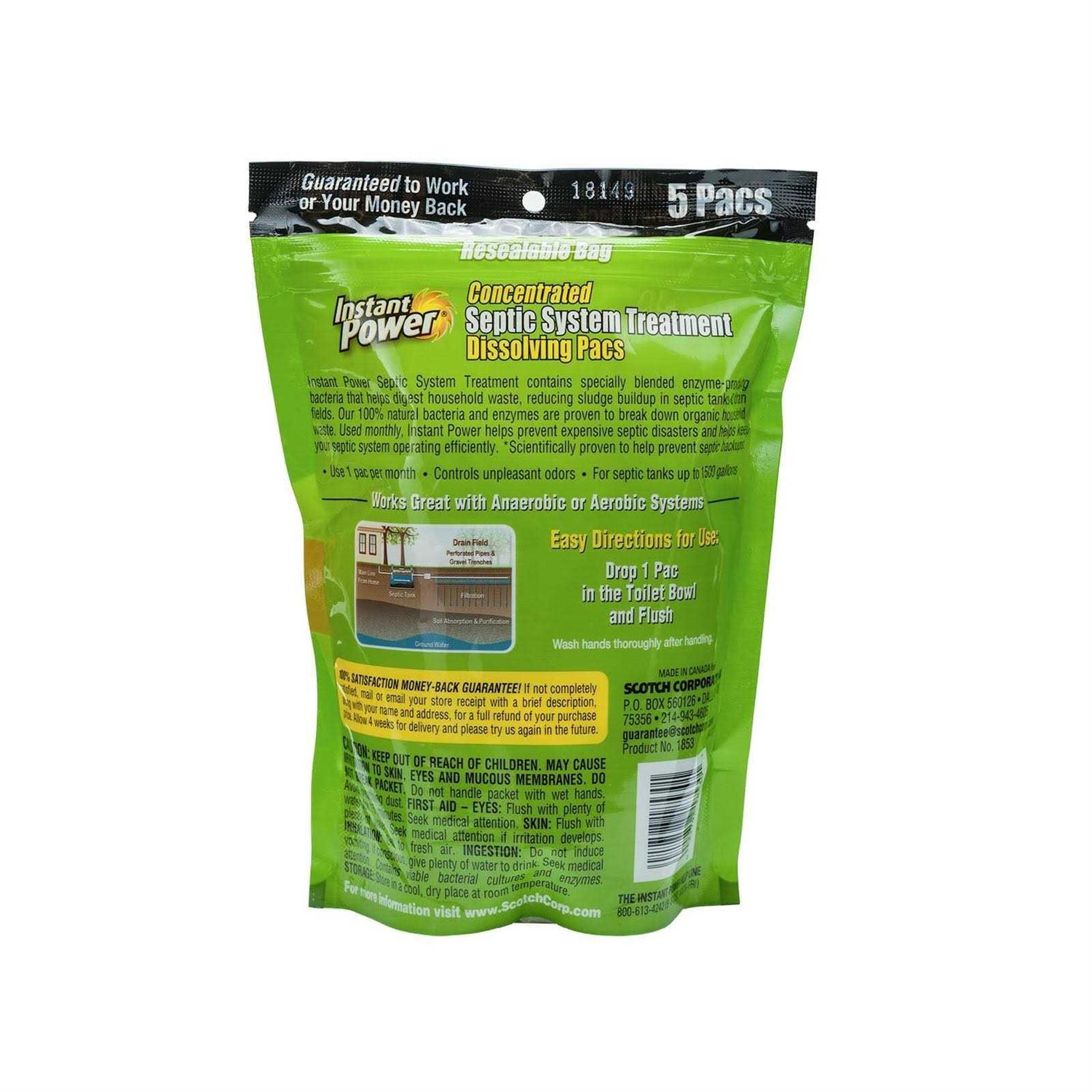 Instant Power septic system treatment pacs contains specially blended enzyme-producing bacteria that helps digest household waste, reducing sludge buildup in septic tanks and drain fields. Our 100% natural bacteria and enzymes are proven to break down organic household waste. Used monthly, Instant Power Septic System Treatment helps prevent expensive septic disasters and helps keep your septic system operating efficiently. Works with anaerobic and aerobic septic systems up to 1500 Gal. This package contains 5 treatment pacs.