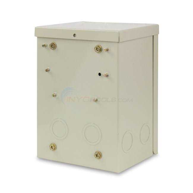 These safety transformers are specifically designed to operate in harsh environments such as high humidity combined with heat and chemicals typically found around pools and spas. The two piece enclosure is made from galvanized steel and electrostatically coated with powder paint in order to weather the elements. With cover removed the high and low voltage compartments are fully exposed and the knock-outs make wiring extremely convenient.