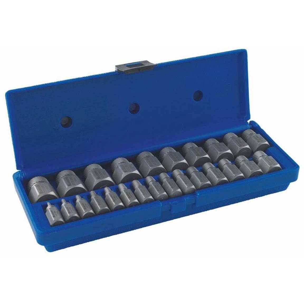 Multi-Spline Extractor Set, 15 Piece, 1/8″ to 9/16″, for Bolts, Studs, Fittings, in Plastic Case Designed to remove broken studs, bolts, socket screws and fittings for high torque applications. Best suited for maintenance and repair work. Designed to remove broken studs, bolts, socket screws and fittings for high torque applications. Aggressive left hand spiral design for extra gripping power. Set includes twenty-five (25) multispline extractors 1/8″ to 7/8″.